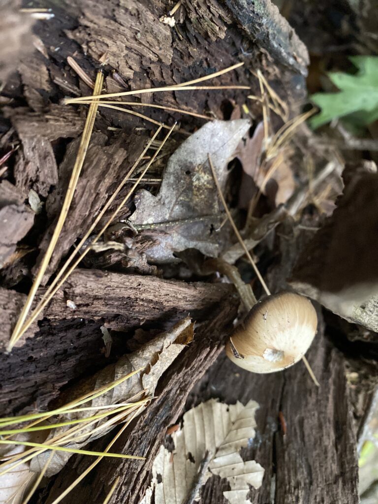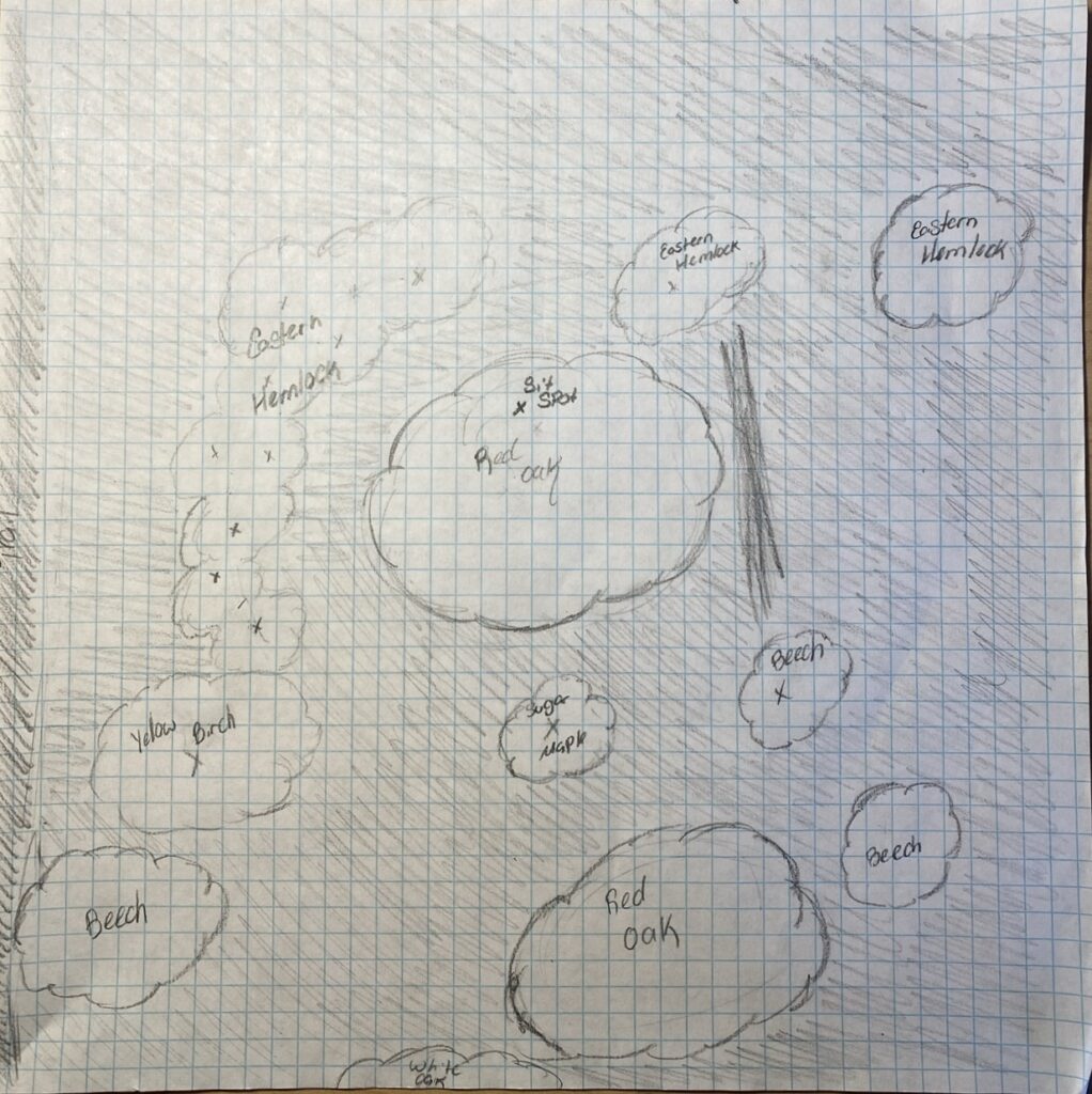 On my return to my spot I was interested to see what had changed since my last visit. The leaves are turning and I was exited to see how that would change the look of my site. Many of the trees in my spot are hemlocks, so not much changed in that right, but interestingly, the leaves on the central red oak were still partially green, with the rest already brown and falling. The beech leaves were a beautiful yellow-orange. I also noticed some new mushrooms as well as evolutions in the ones I saw last time. Below is a birds eye view rendition of my sit spot.