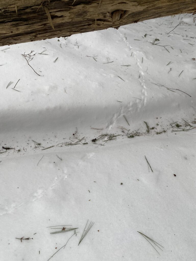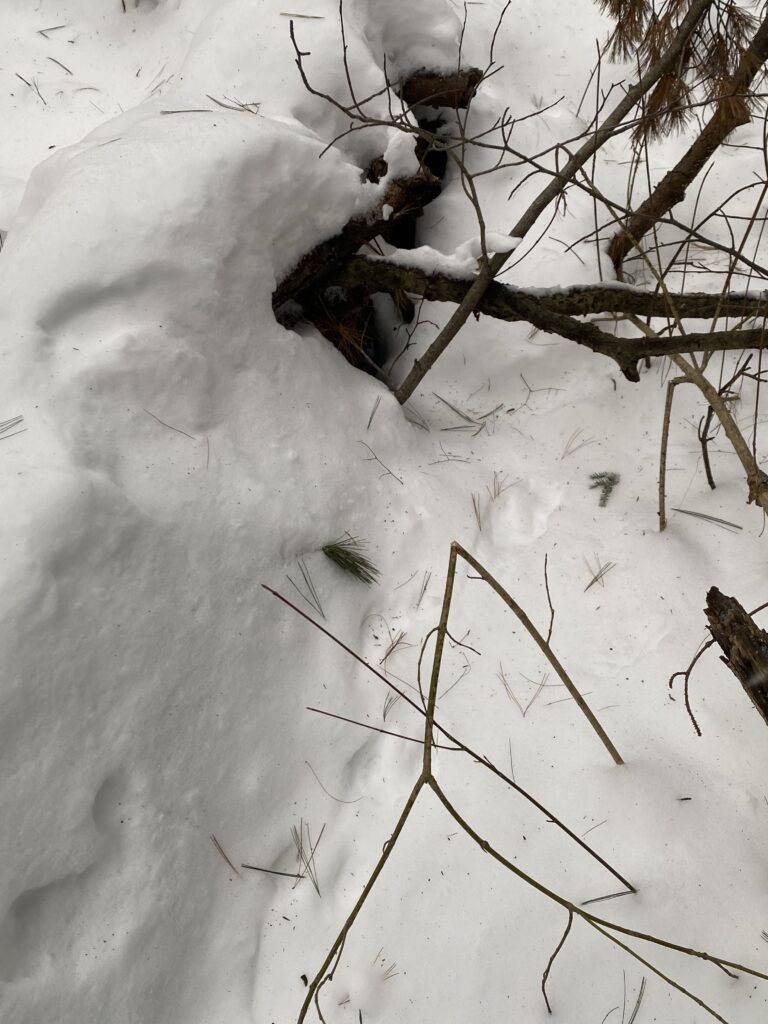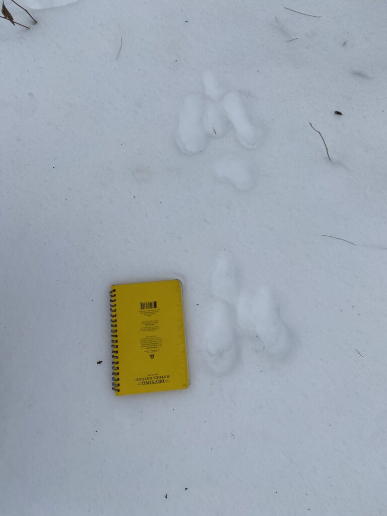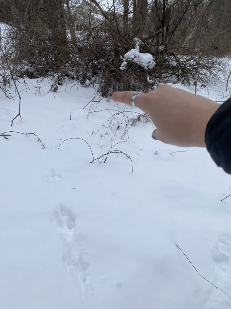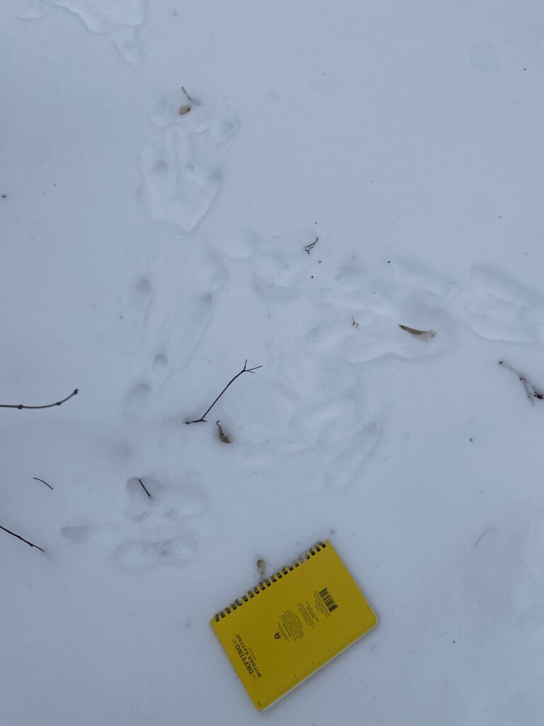 Some of my friends and I took a walk around to do some tracking in Centennial Woods. We took this opportunity to explore parts of the woods away from our phenology spots and see new parts of the property. The majority of our observations were rabbits or hares, but we saw some squirrel and small rodent tracks. I’m unsure exactly as to whether the tracks belonged to regular rabbits or snowshoe hares, but due to their size, I’m leaning towards snowshoe hares. It was easier to determine the squirrel tracks because they would end abruptly at a tree where they either climbed up or jumped down. We also observed a den with tracks around it that I believe belong to a snowshoe hare. Below are some of the photos from this trip.
