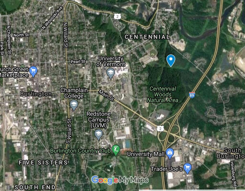 Google Maps. (2020). [Centennial Woods. Burlington, VT] [Satellite]. Retrieved October 10, 2020, from www.google.com/maps