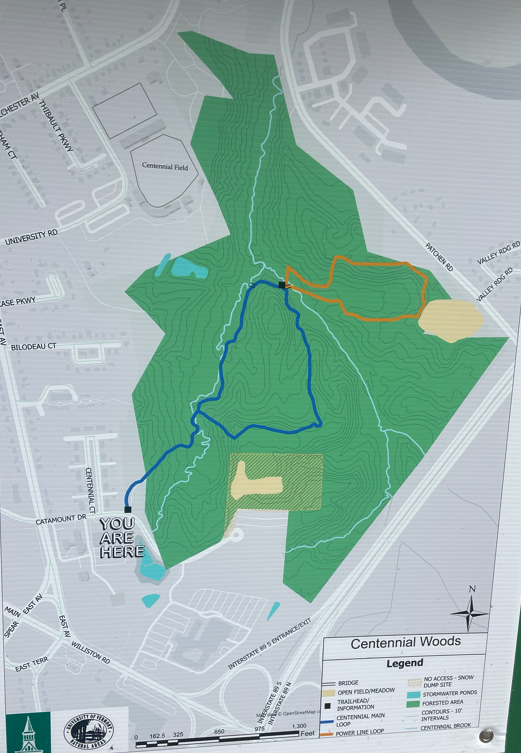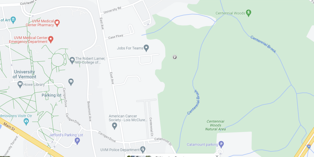 To get to Centennial Woods from the Aiken Center or the Davis Center, you will want to walk past the greenhouse and through the parking lot outside of the Davis Center. Then, when you get to the parking lot, walk down Carrigan Drive, which then turns into Catamount Drive, towards the police station. Passing the police station, there will be a sign that says UVM Centennial Woods and that is the trailhead.