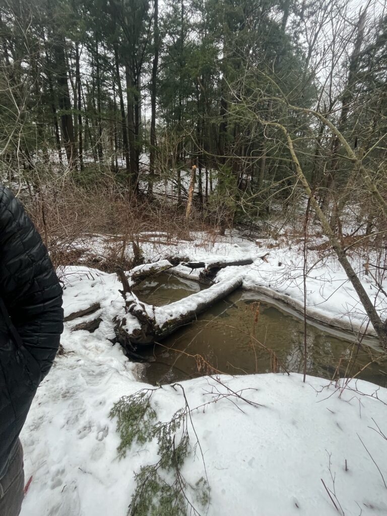 In Centennial Woods, there are significant changes from the fall. For example, there is no more leaf litter on the ground and it is mainly ice and snow. Today there was less snow due to the recent rain, but it still has more snow than there was last semester. Additionally, all of the trees, with the exception of the Evergreens, have lost their leaves. There is ice along the banks of the creek that flows through Centennial Woods and the ground was harder than it was last semester. Additionally, in the fall you could hear squirrels in the trees and birds making their calls, and as I wandered around Centennial Woods, I noticed a significantly less amount of animal activity.