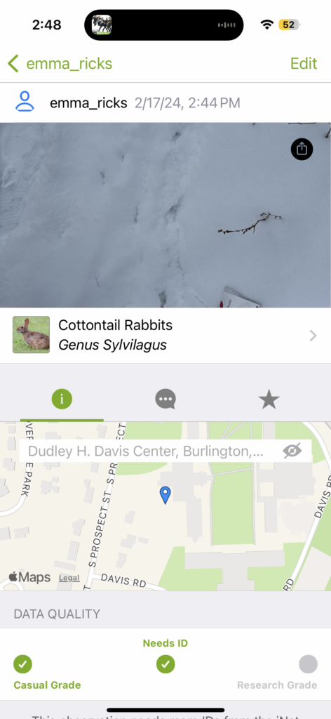 Using the iNaturalist app is a relatively easy task. I enjoyed the process and I liked being able to see what my peers have posted and observed around Burlington. I also liked how the app is easily accessible for posting observations right as they are seen.