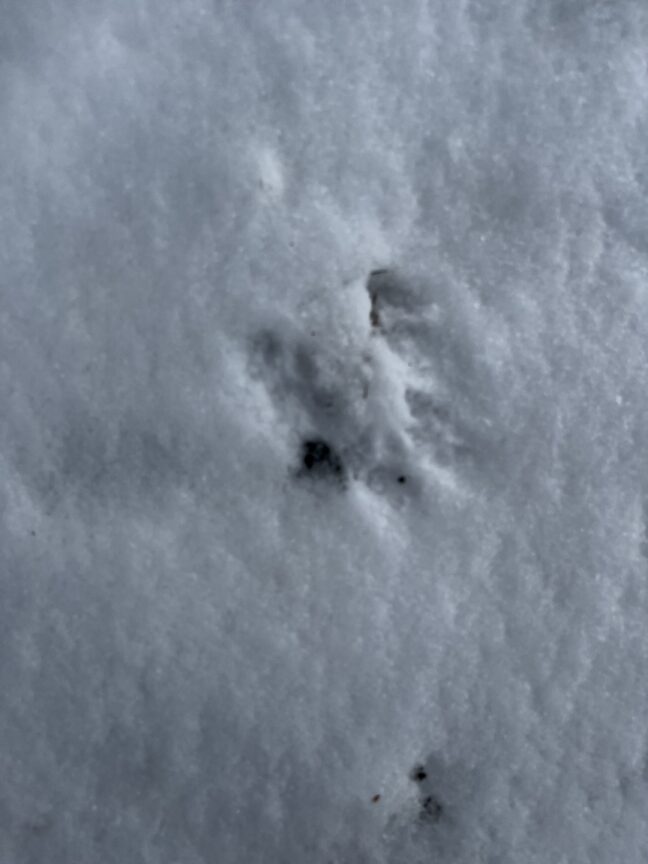 Animal Tracks Posted on January 30, 2022 by eghastin This is one animal track that I found, likely from a gray squirrel. These tracks led from one of the trees and ended at another one about 20 feet away.