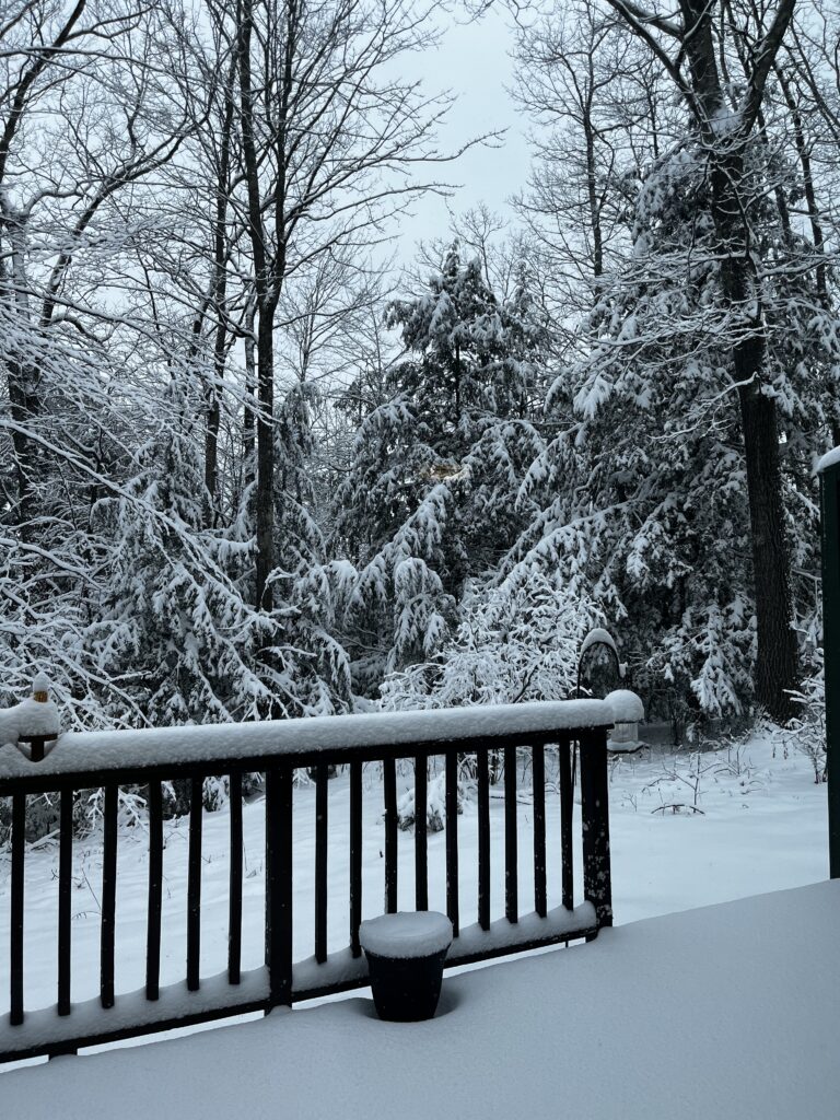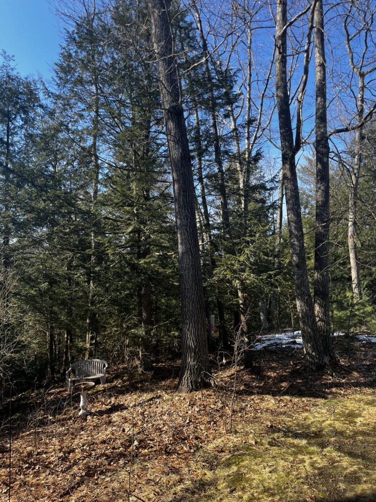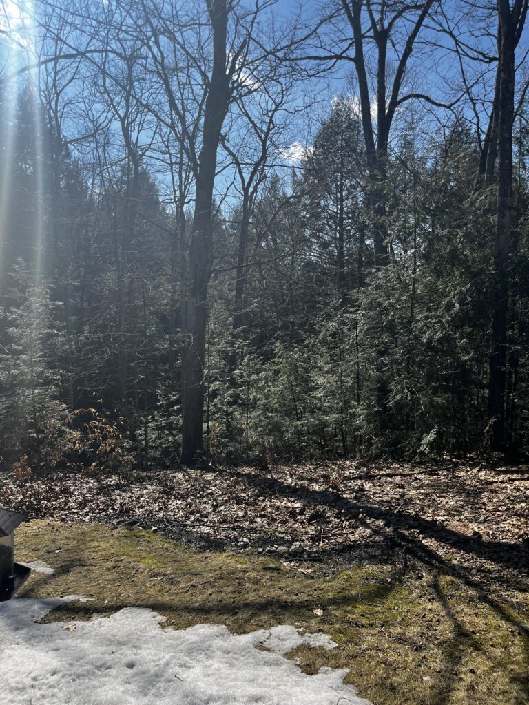 The space behind my house holds access to a few nature trails and is a really nice spot to explore the surrounding species. I put in pictures from a few days ago before the snowstorm and a picture after the snowstorm to share what my backyard looks like in different weather occurrences. While I was exploring I was able to identify a couple black-capped chickadees that frequent my bird feeder and I also spotted a red-winged blackbird. There is an abundance of Eastern White Pines in these woods along with some Eastern Hemlocks. Compared to my other phenology site, I see a lot of the same species, but the ones in these woods are a lot more abundance and not as spaced out as the Red Stone Pines.