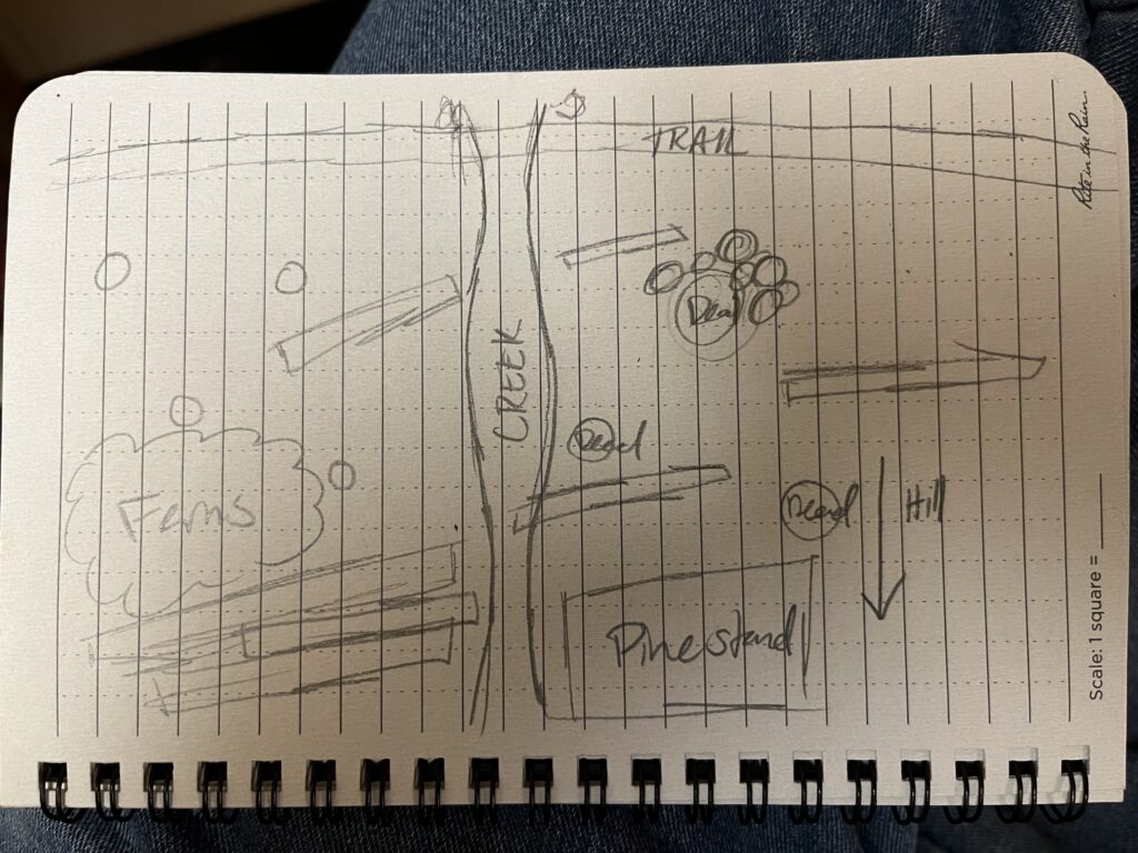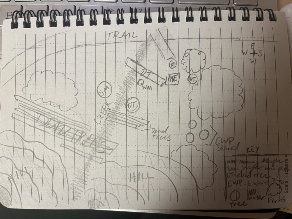 The most prevalent landmark in my site is obviously the creek, but another one (and my favorite) is the standing dead tree near the trail. It’s seen on the map as the dead tree closest to the top of the page, and it was a huge help when I was first trying to remember where my site was at the beginning of the year. Thank you dead tree <3