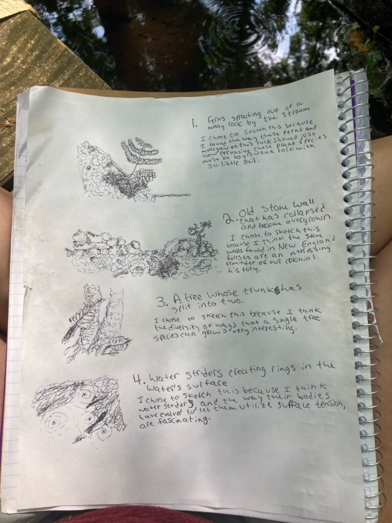 I had a really incredible experience with sketching. Generally, I don’t consider myself an artist, and I was a bit nervous to do this activity due to my artistic abilities. But once I was in the field and determined to capture each of my scenes, I got really into sketching! I noticed so many little details and interactions I never would’ve without making my sketches. Even just looking for things to sketch made me connect more with and think deeper about my surroundings. Next visit I think I’d like to look more into the frogs at the stream, and maybe see if I can spot other species.