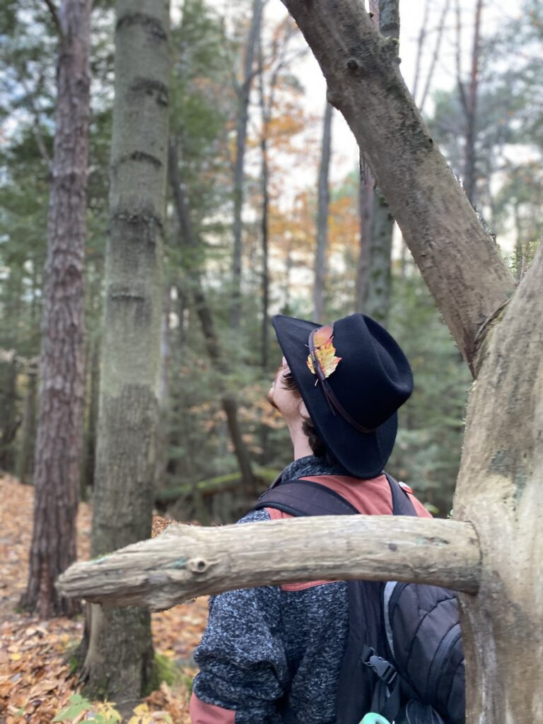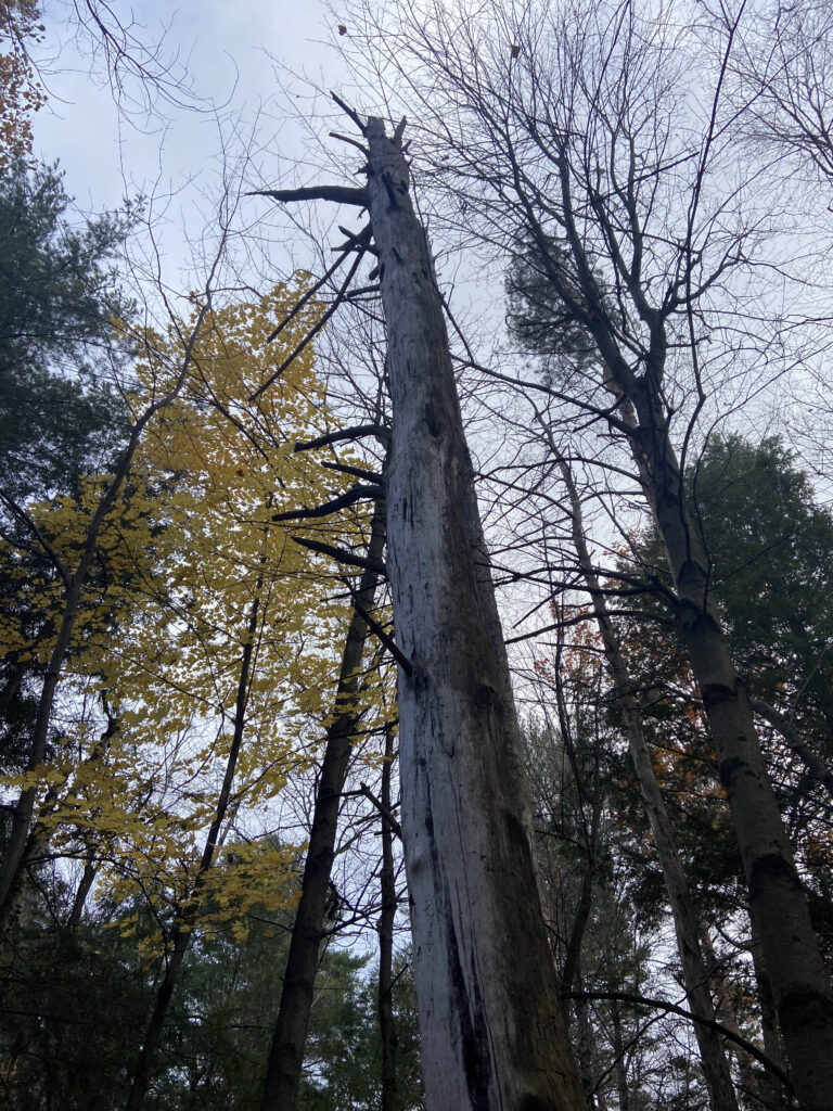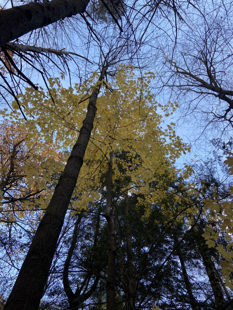 The Canopy of the forest drew my attention away from the ground and to the trees. I decided to try and identify every tree in the direct vicinity of the Ridgeline. Here is pictured the tallest Sugar Maple directly with brilliant yellow leaves. An Eastern Hemlock can be seen in the foreground spreading its identifying needles toward the sky. The most common tree in the area is the Large-Tooth Aspen trees which litter the ground with their organic litter. Two dead trees are unidentifiable due to no needles or bark. I wonder if this has something to do with the fungus, and if they are also Aspen trees?