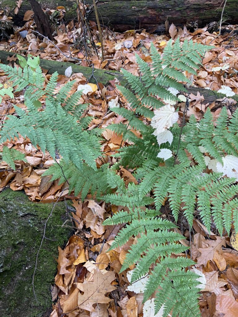 Although 75-80% of the ground cover was fallen leaves, some other plants peaked its way through the earth. Here was the largest group of ferns in the direct area.The rest of the ground cover was made up of moss and leaves.