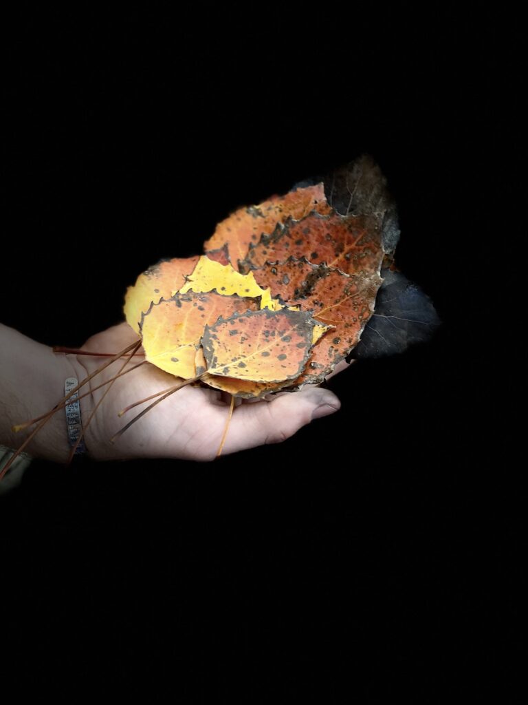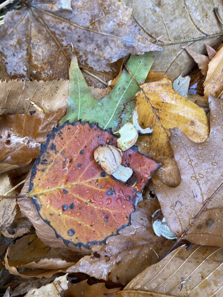 Just as I was finishing analyzing the foliage something caught my attention out of the corner of my eye. Just next to the mossy log laid this brilliant orange Aspen leaf with a cracked nut lying perfectly on top. This sparked my imagination and I thought of the squirrel who had used this leaf as its own dining table. I like to think the squirrel also saw the beauty in the leaves and had chosen this place for his lunch. I hope I didn’t disturb them and they were able to come back to finish their meal!