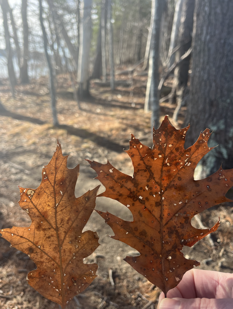 For honorable harvest I decided to take a white oak and red oak leaf from my house (which is about a two mile walk from my spot) and leave them on the forest floor!