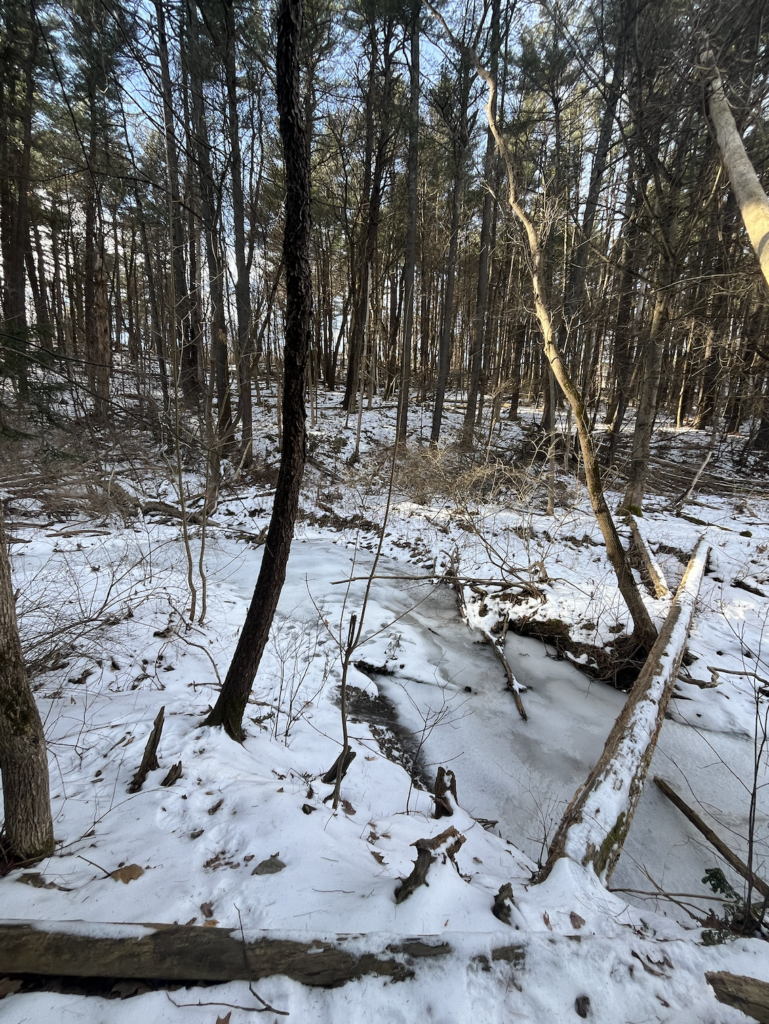 A month earlier before it froze over, I could hear the stream running from a dozen feet, but now since its completely frozen over the stream is silent.