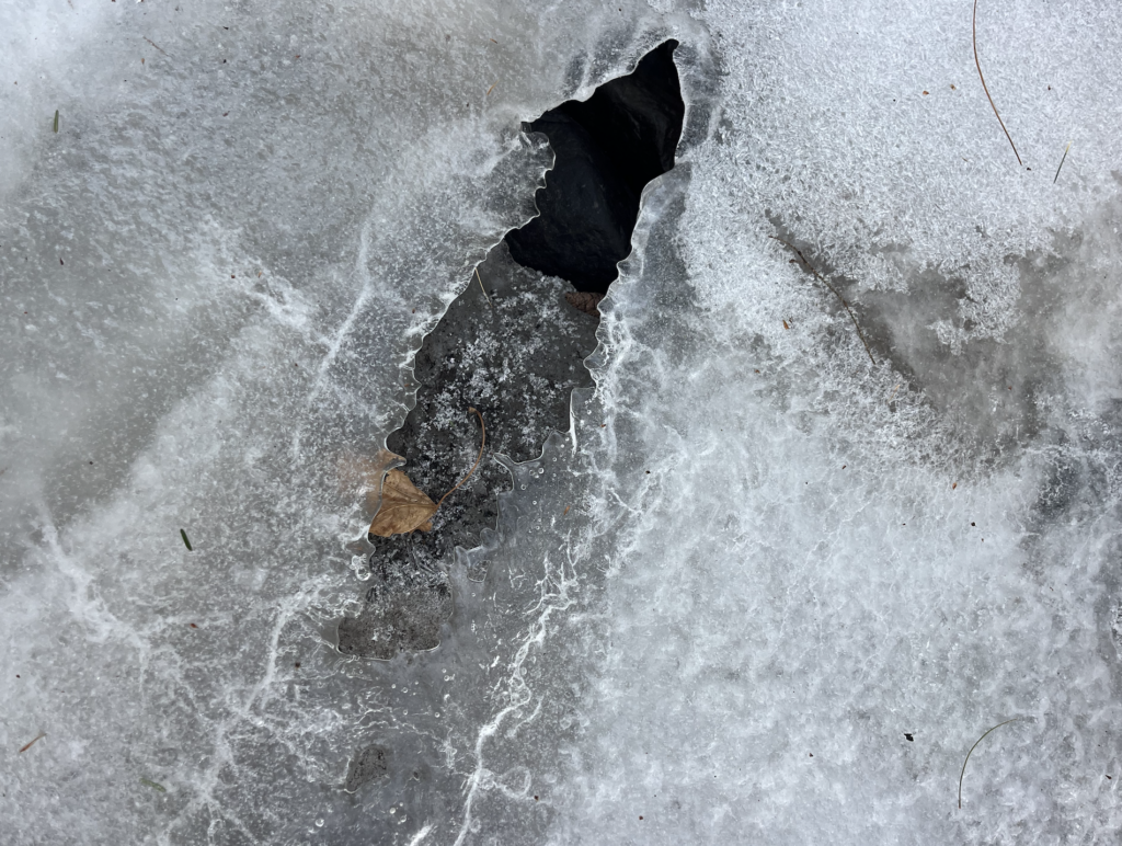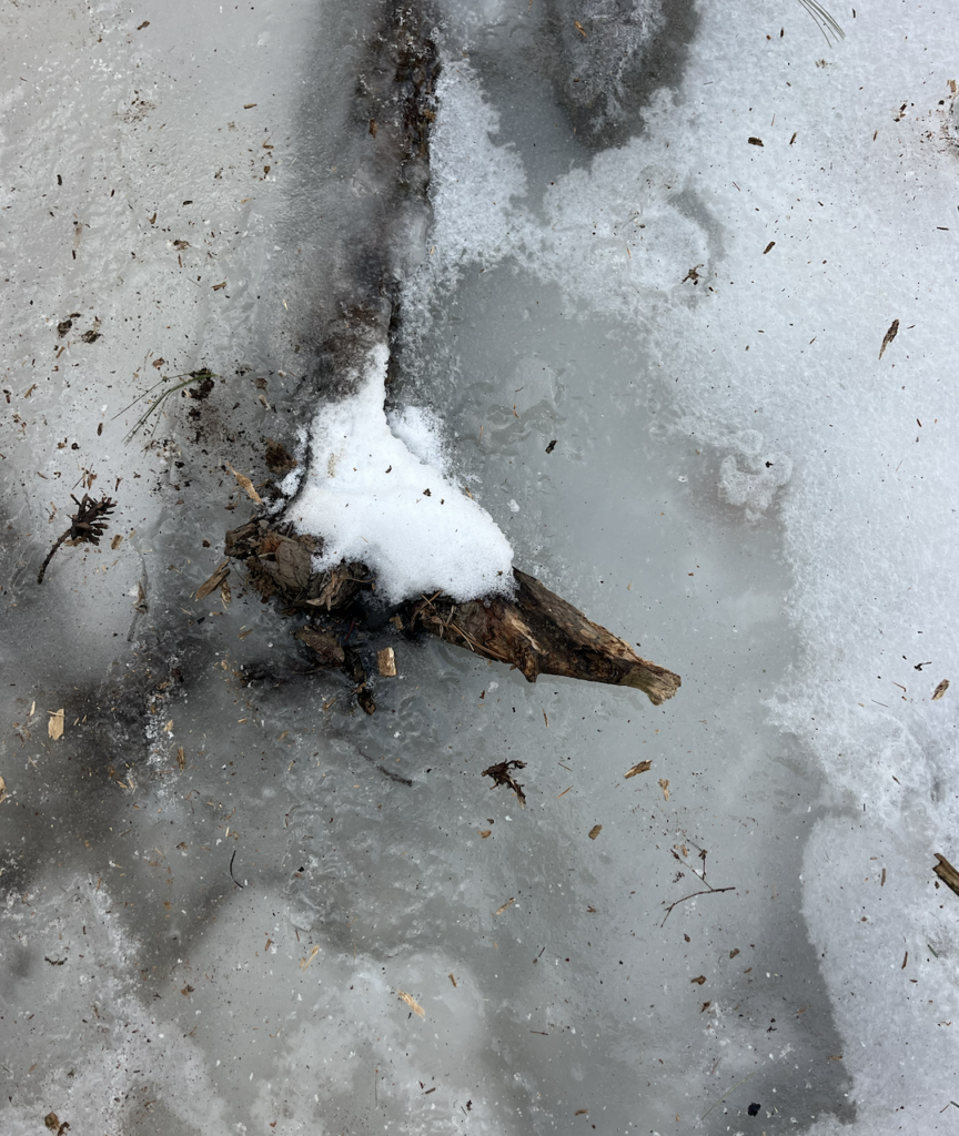 -debris has frozen into the stream, like small rocks and sticks/logs and throughout the stream there are small gaps that have occurred from the thawing