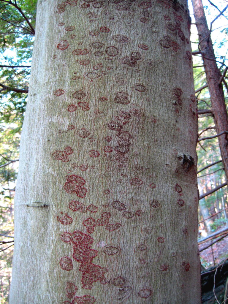 After researching for a while, I think that the pink fungus adjacent thing growing on the first picture could be Beech Bark Disease, which eventually kills Beech trees (below is an extreme image of this fungus from google)