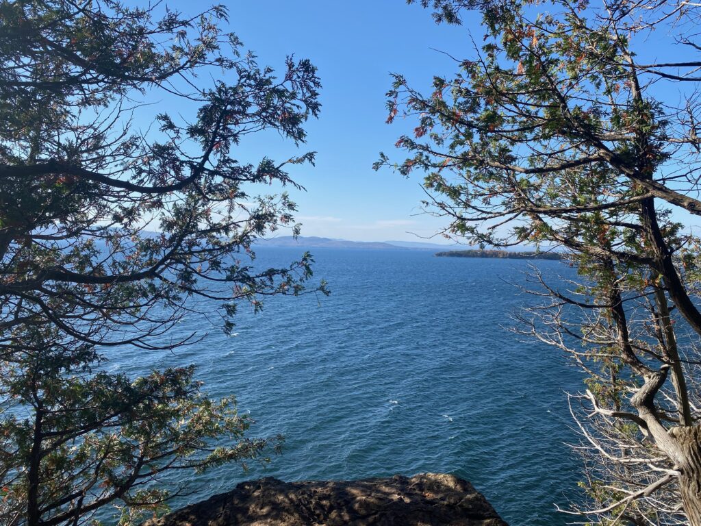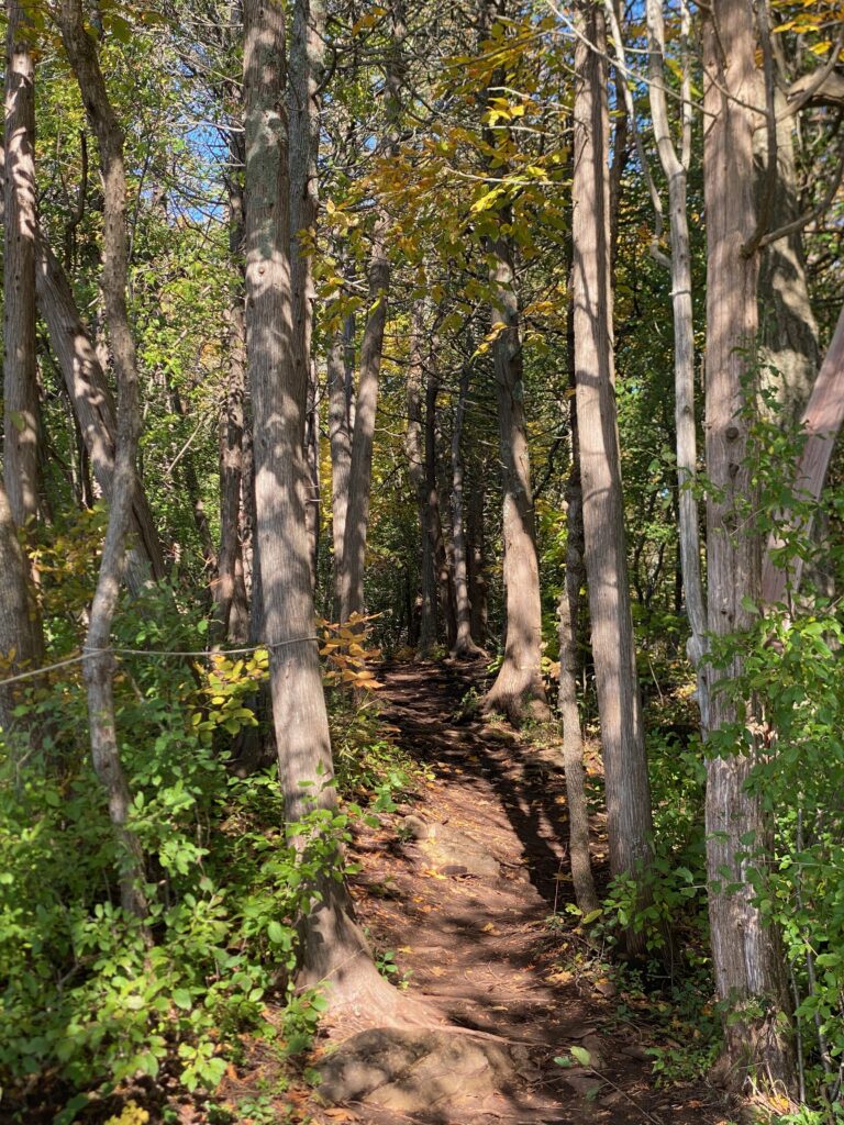 While we were discovering the unique features of Rock Point in my Natural History lab, we learned about the special limestone bluff cedar-pine forest that was within; that these unusual ecosystems only occur on limestone bluffs overlooking water, and that they have longer growing seasons due the moisture from Lake Champlain. Naturally, I was curious to see how the transition to fall would look here in the cedar-pine forest compared to how the transition would look on campus.