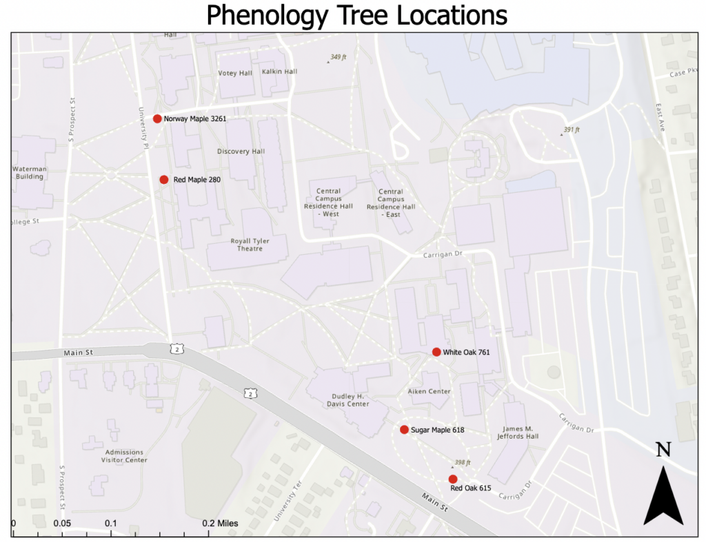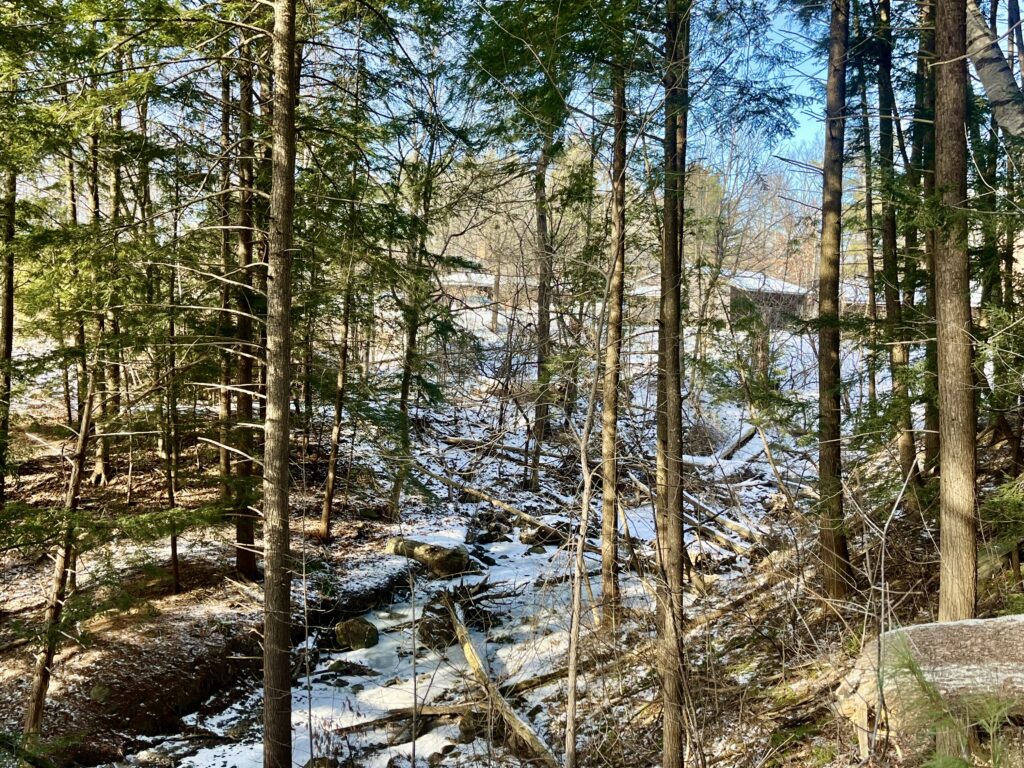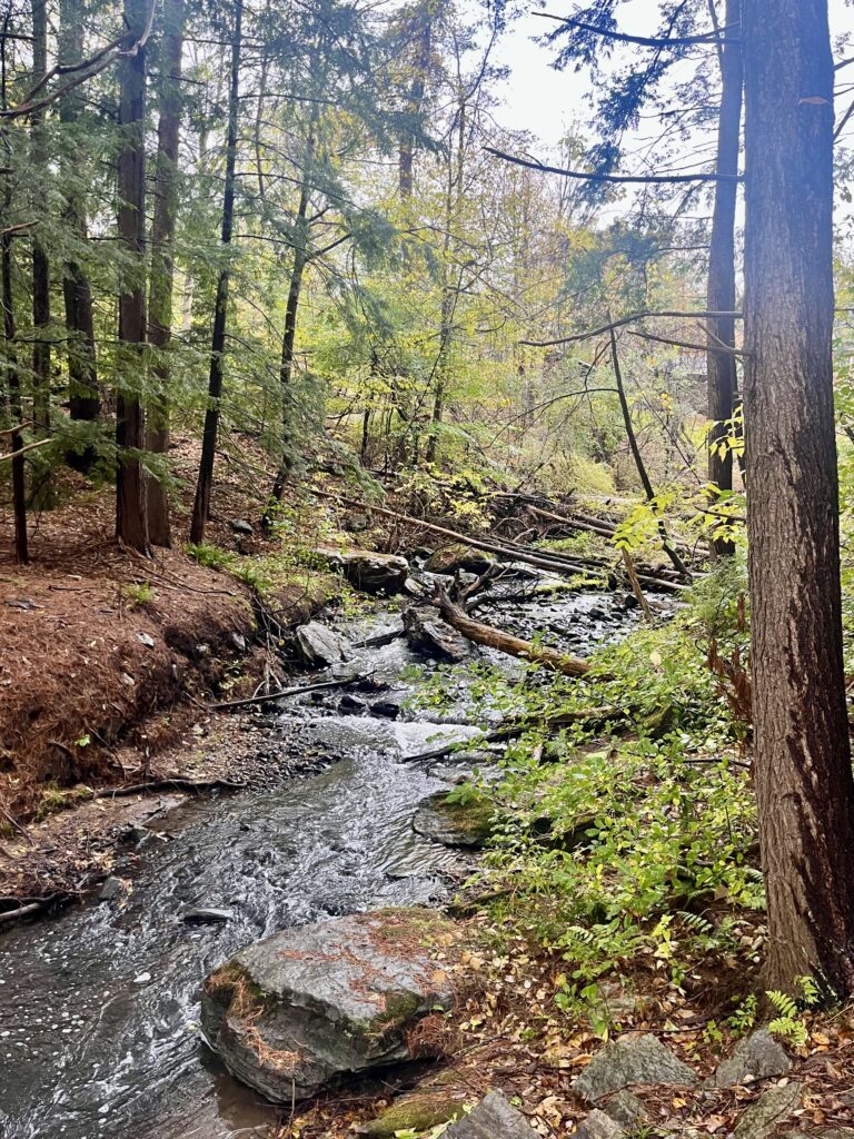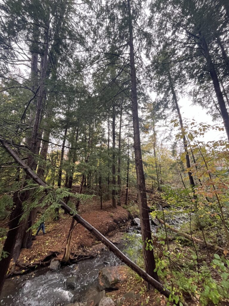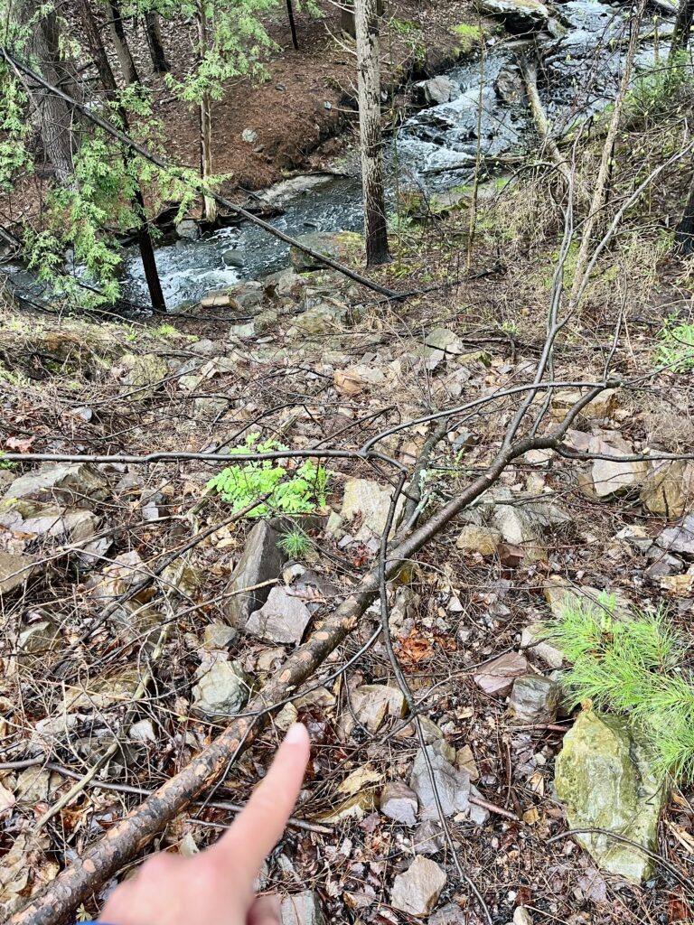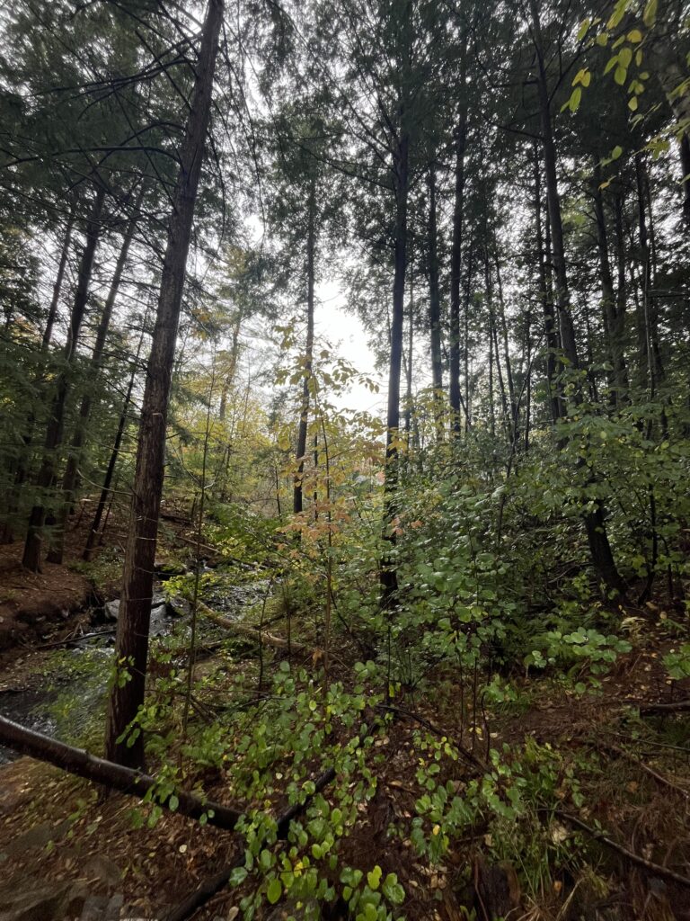 The major landmark is the bridge that my phenology site sits underneath, along with the largest Norway Spruce that towers over the bridge and shades part of the stream. The minor landmarks are the young Eastern White Pine that greets you as you venture down the steep hill to the stream, the downed log that lies across the upper part of the water bank, and the snag on the right side of the stream.