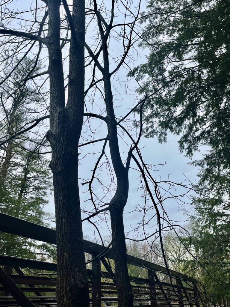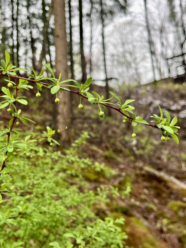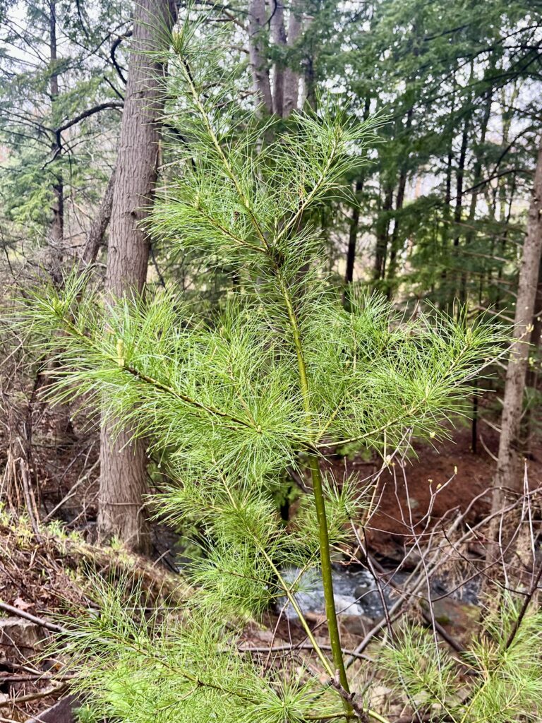 The understory of my site has experienced significant changes over time due to it being predominantly small beech trees, ferns, and smaller woody plants that bloom in the spring. However, the overstory of my site has stayed relatively the same from September to May as it consists mainly of Norway Spruces and Eastern White Pines, which do not experience leaf loss or change in color during the winter. When I first entered my site, I noticed a new fallen branch that was blocking the path I normally take down to the water. This encouraged me to look up at the tree it had fallen from, a Norway Spruce, only to find that there were many other branches that had broken but were still hanging up in the tree. Additionally, the Eastern White Pine that I have been tracking over the seasons now has a green stem, which I didn’t notice before, and new buds in the middle of all of the needles. Finally, I have noticed additional erosion on the sides of the stream bed. This is most likely from heavy rain events and the snow, which are increasing the water level.