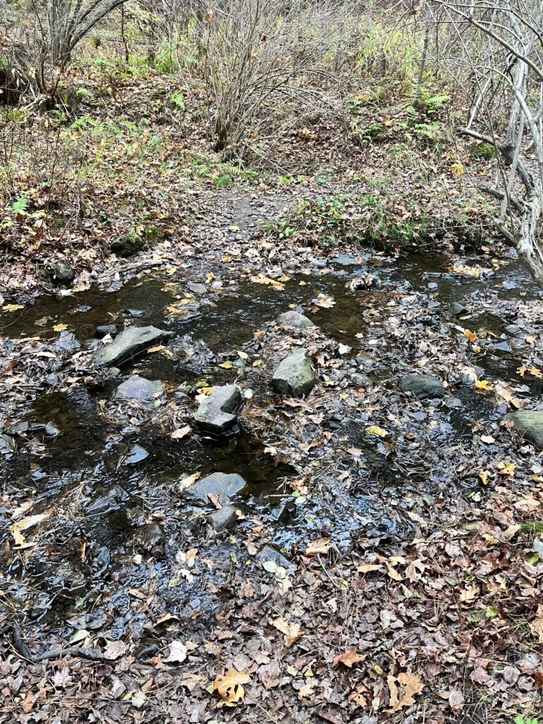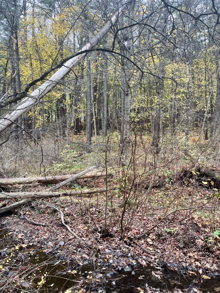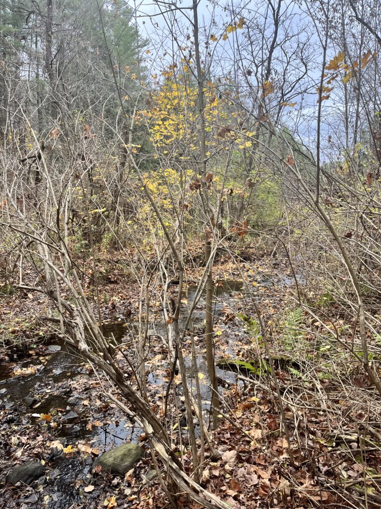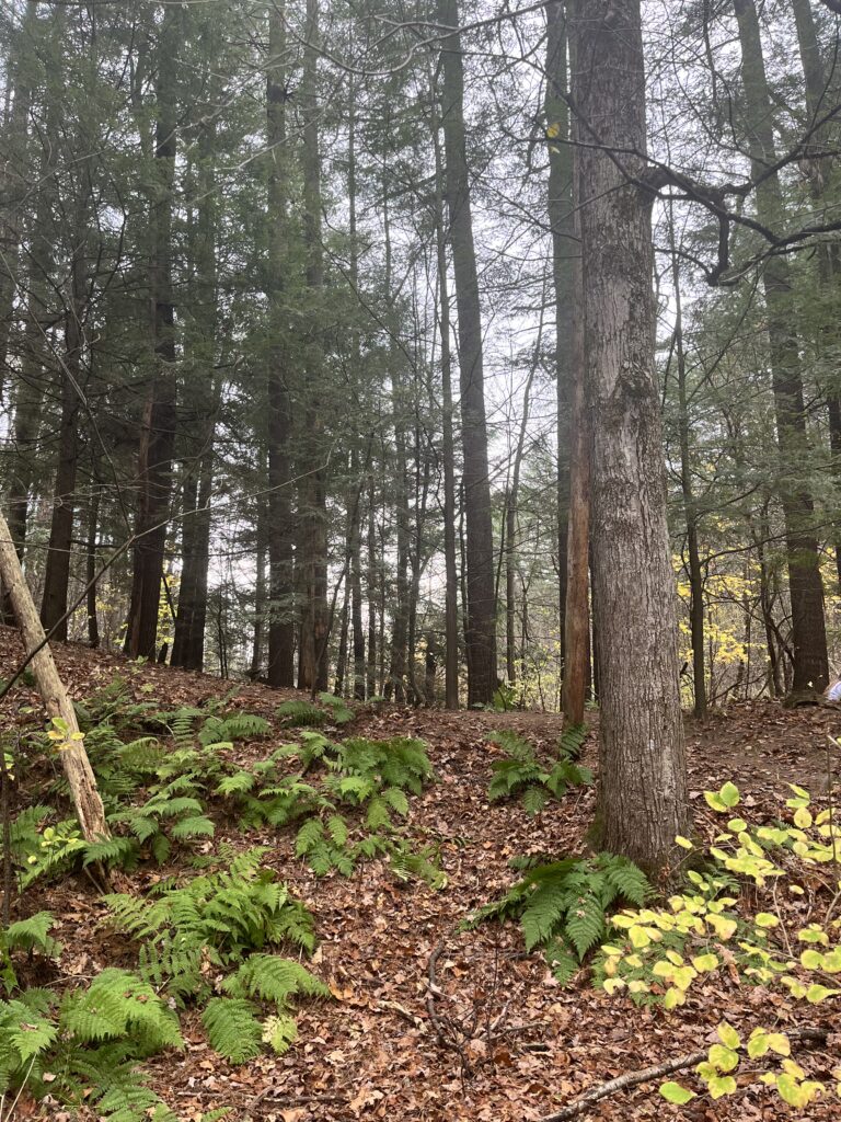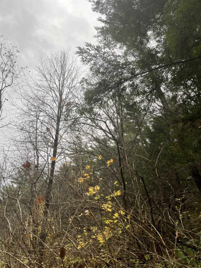 It was a particularly warm and cloudy day at my spot in Centennial Woods with a rainstorm looming. I was shocked to see just how much the vegetation has changed since I was last at my spot 3 weeks ago. The ground was densely covered in the fallen leaves of most of the trees, so much so that they were obstructing the flow of the brook. At some points of the brook, the water was stagnant as the buildup of leaves had caused almost a dam. Naturally, because all of the leaves are on the ground, all trees except the conifers were bare. The Eastern White Pines seem to be thriving, as well as the many ferns that reside below the canopy. At the brook I did find a honeysuckle plant that was still holding onto its leaves as well as a Norway Maple, although that tree will be bare soon enough. The woods are almost completely prepared for winter, even though the weather proves otherwise.