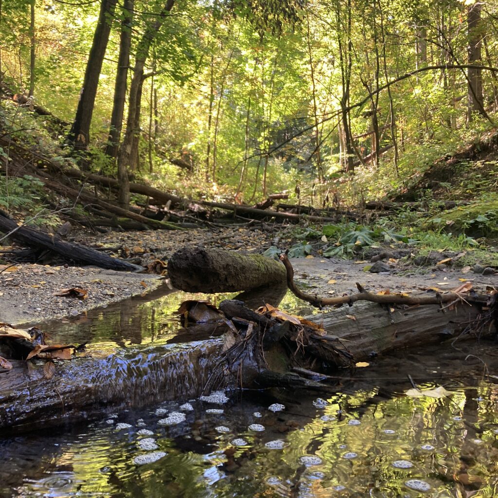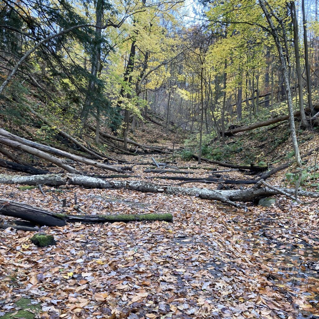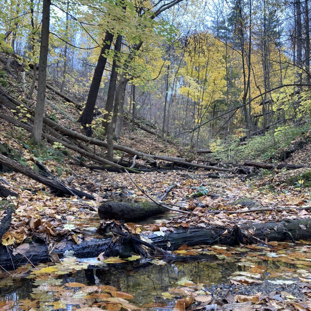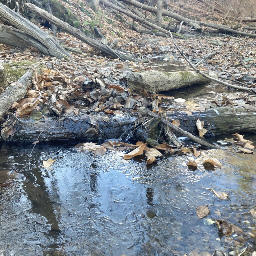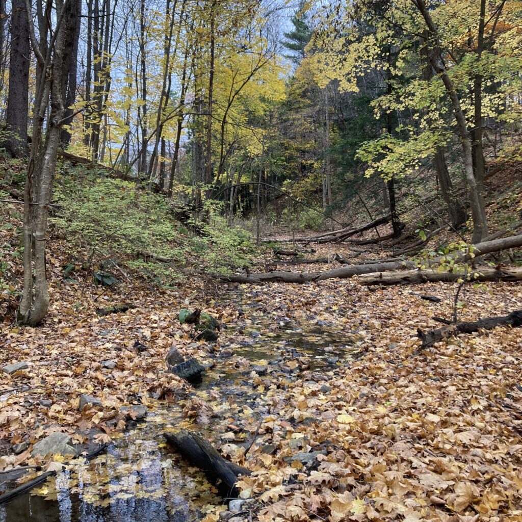 It’s 40 out this morning, but my phone says the wind chill is making it feel more like 30. As I pause to add a layer and put on some mittens, I consider turning around and coming back when its a bit nicer out, but I press on towards the stormy clouds and biting breeze. As I reach the woods, it is clear that a lot has changed since last I visited. Almost all the trees have lost their leaves, with the exception of the white pines, Norway maples, and a few American beech that are holding on to the last of their orangey brown leaves. The color pallet has shifted, while their is still some green undergrowth present, most of the the bright emerald and chartreuse hues have been replaced by yellows and oranges. The path the water takes as it flows through this divot in the landscape has also changed. The carpet of fallen leaves has caused the shallow stream to pool up in some areas, and change course in others.