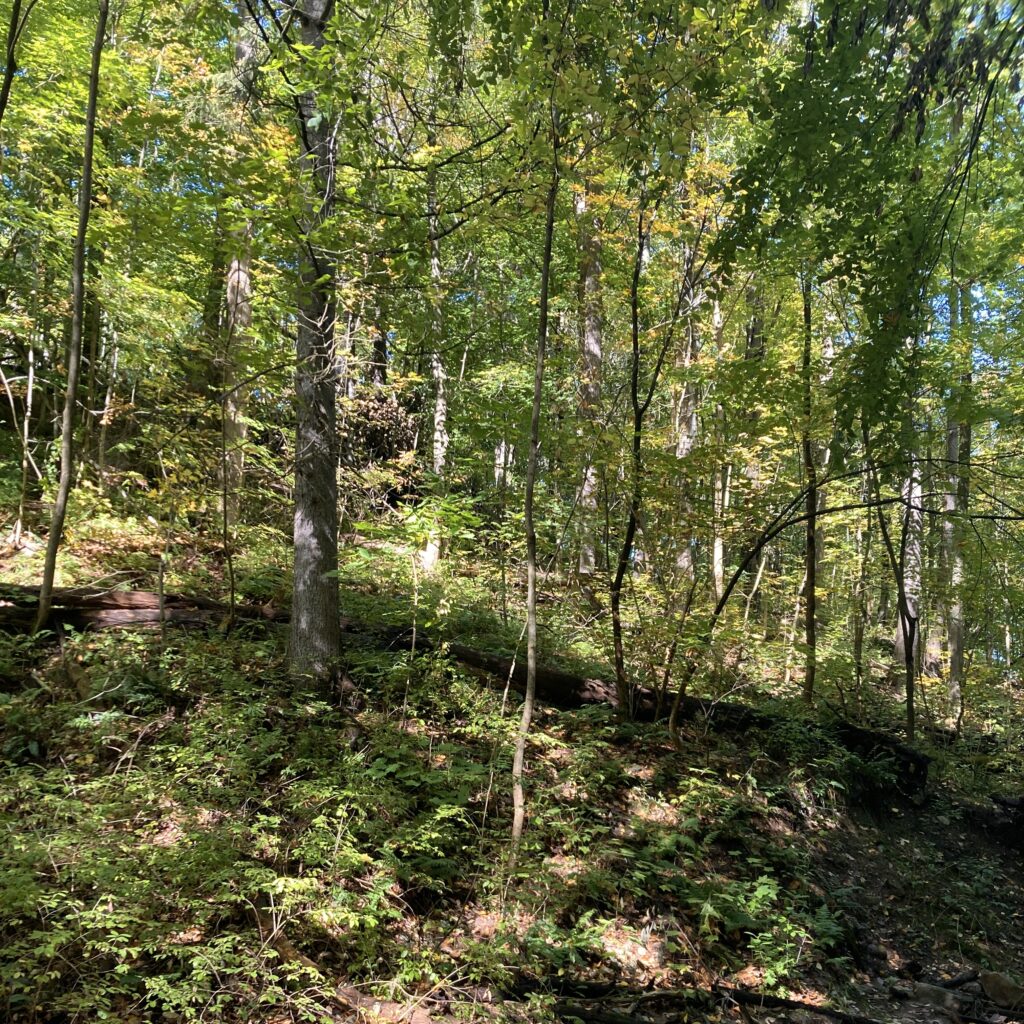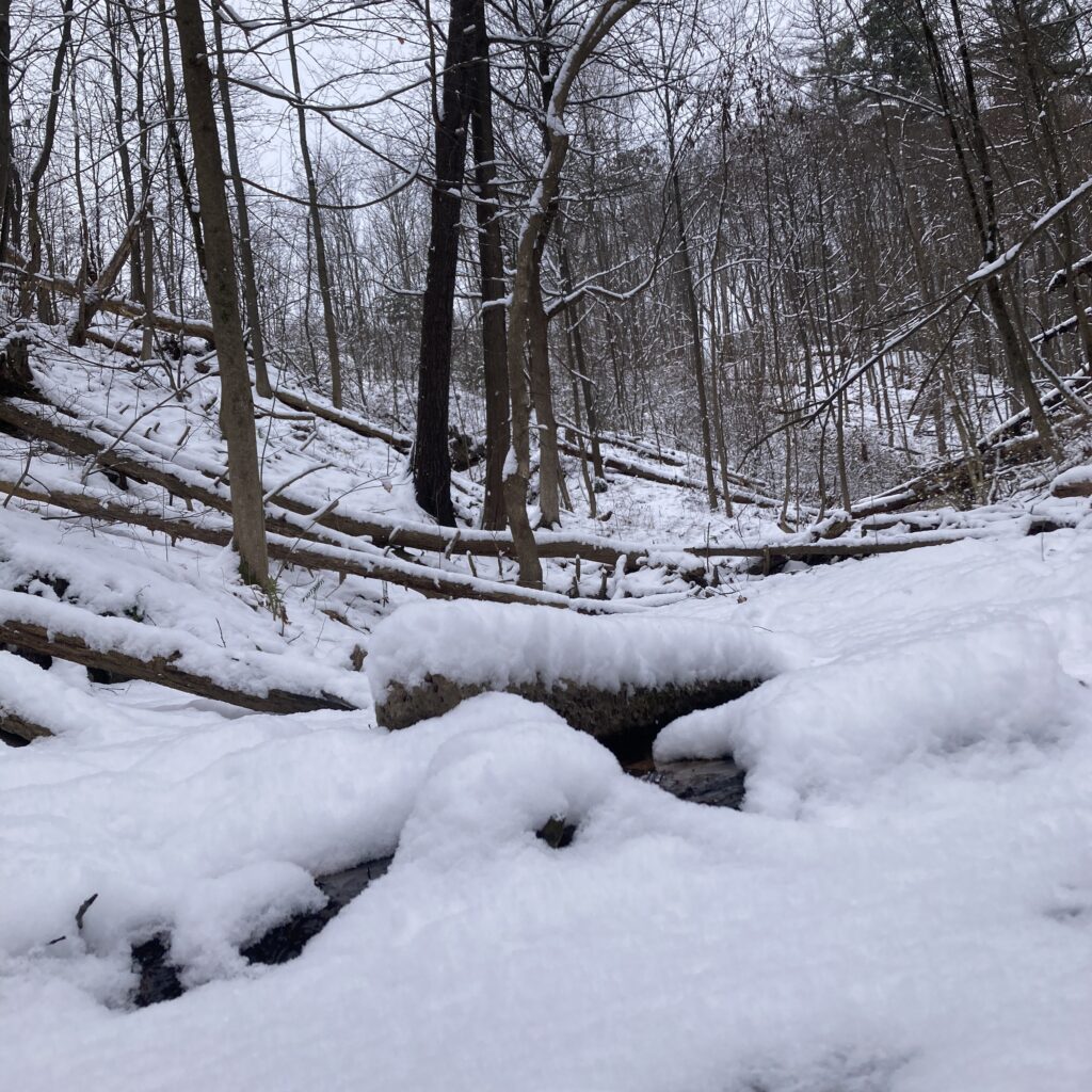 It has been over a month since I have visited my Burlington phenology site, and lots has changed. Any leaves that remained on the trees in November have fallen to the ground, and there is hardly any green vegetation in sight. The leaf litter has visibly aged, it is less abundant and much browner. The few conifers in the area hang on to their green needles, a handful of tired ferns persist, and moss still covers the damp rocks and logs, but otherwise the woods are barren. The lack of vegetation makes the area feel exposed; it is much more open without the dense cover provided by the leaves that were once here. This did make it easier to spot any signs of life up in the trees, but there was little to see. I observed mostly chickadees, as well as a few white breasted nuthatches, a tufted titmouse, and a brown creeper. There were also a few distant squirrels. I didn’t find any signs of any additional species, although I suspect that some snow on the ground may reveal tracks of more species. The water is still flowing about the same as it was a month ago, although most of it now has a very thin layer of ice. I look forward to returning to my site when winter is in full swing to further observe changes to the area.