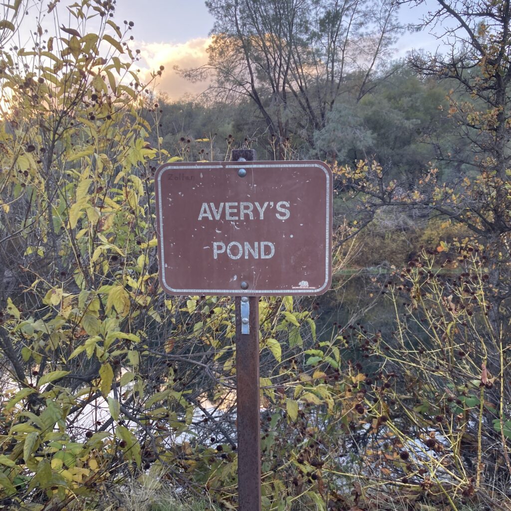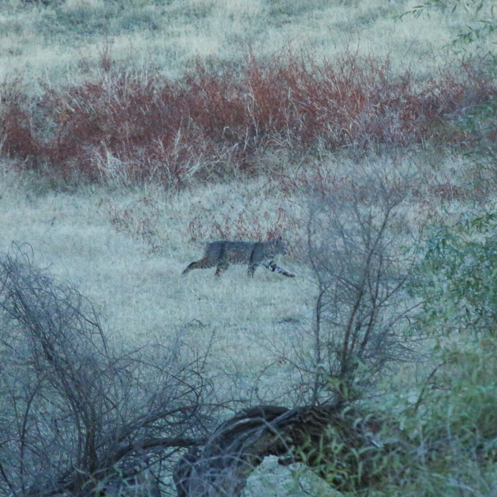 This location also tells an excellent story of land use over the years. Along the river bank there is a distinct set of granite boulders marked by their deep wells. These are grinding stones worn into the rocks over decades, perhaps centuries, of use by local Indigenous groups. Acorns were a staple food of this area, and were pounded into a flour that was then leached of the harmful tannic acid and cooked into the base for many foods. These grinding stones can be found throughout the region. The American River was a significant site in the period of the gold rush, and was subsequently settled by Europeans. Avery’s Pond represents this time period of colonization. Ira Avery came to California from Maine with his father in 1853 when he was 15 years old. After a variety of working ventures, Avery bought his new father in laws’ orchard, located along the American River. Avery’s pond is a former irrigation pond constructed here to supply water to the orchard. This orchard grew persimmons, cherries, and pears, with Avery focusing especially on cultivating the Hyakume and Hachiya persimmon varieties. The original reason my family and I came out to Avery’s Pond on this day was in search of a cutting from a Hachiya persimmon tree, a variety we don’t yet have. We have a quince tree grown from a cutting near Avery’s pond and knew of both this quince tree and one persimmon tree in the area, but upon further exploration around the pond it quickly became clear that there were a lot more than just the one persimmon tree. We found many fruiting persimmon trees, a second quince tree, and a pecan tree. These trees are likely remaining from the time this land spent as an orchard, or seeded from old orchard trees. Finally, the land today is used as a recreational area. Nature has taken back much of the cultivation that once occurred, and a happy ecosystem is indicated by the biodiversity of plants and animals. The most notable animal we spotted was a bobcat, pictured below.