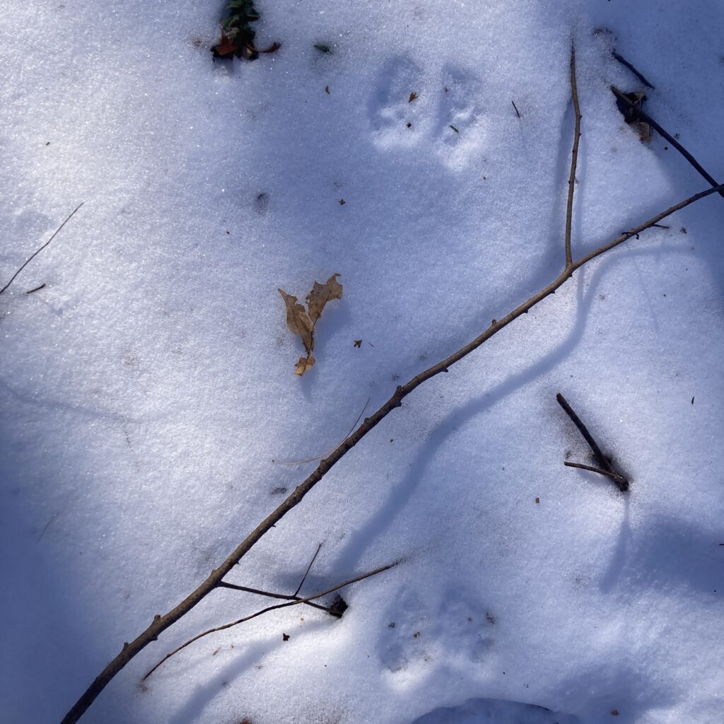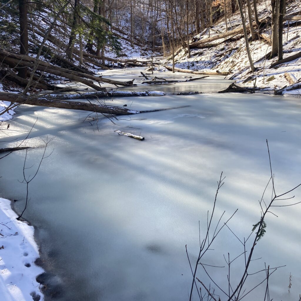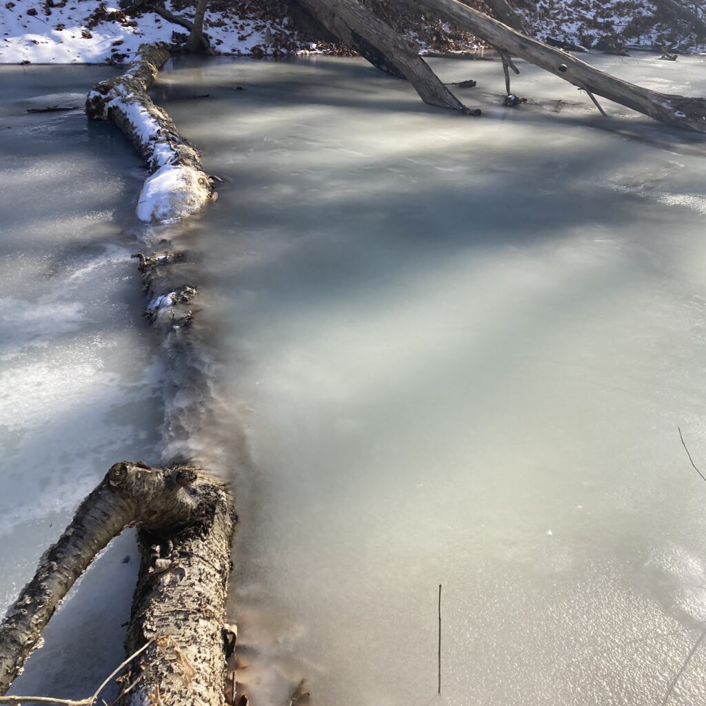 This was my coldest visit by far, and surprisingly icy. I was hoping to search for tracks and other signs of animal life in the snow, but instead I was confronted by a large, mushy, and partially frozen pond. At first appearances I thought the ice was solid enough to walk across, but it was not. I managed to get across a narrower part in a few steps, but didn’t feel confident enough to walk all the way to the center of my phenology spot. Unfortunately the steep slopes that surround my spot made it very difficult to go around the ice so I had to settle on a very limited range of movement. The only tracks I saw appeared to be that of squirrels, and I also saw quite a few squirrels in the area. Aside from the ice, not much has changed since last I was here. The vegetation (or lake there of) appears the same, and I didn’t notice any additional major developments.