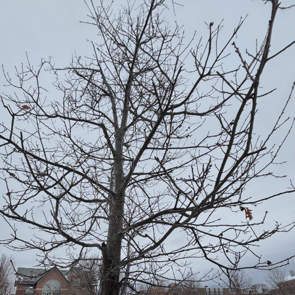 Of the 11 phenophases, most trees were negative for almost all of them. The Norway maple exhibited none of the phenophases. The red and white oaks showed none of the phenophases, aside from some leaves left over from last season; the white oak had an estimated 75% of its leaves left from the fall, while the red oak only had only a few leaves. The sugar maple and the red maple were beginning to show breaking buds, but had no other visible phenophases. The red maple showed many more breaking buds than the sugar maple, which had only a few of the early buds breaking. This shows the pattern that both oak species held onto some leaves through the winter, and that the maples were quicker to break buds than the oaks (not including the Norway maple). Below I have included pictures of each tree from my observations.