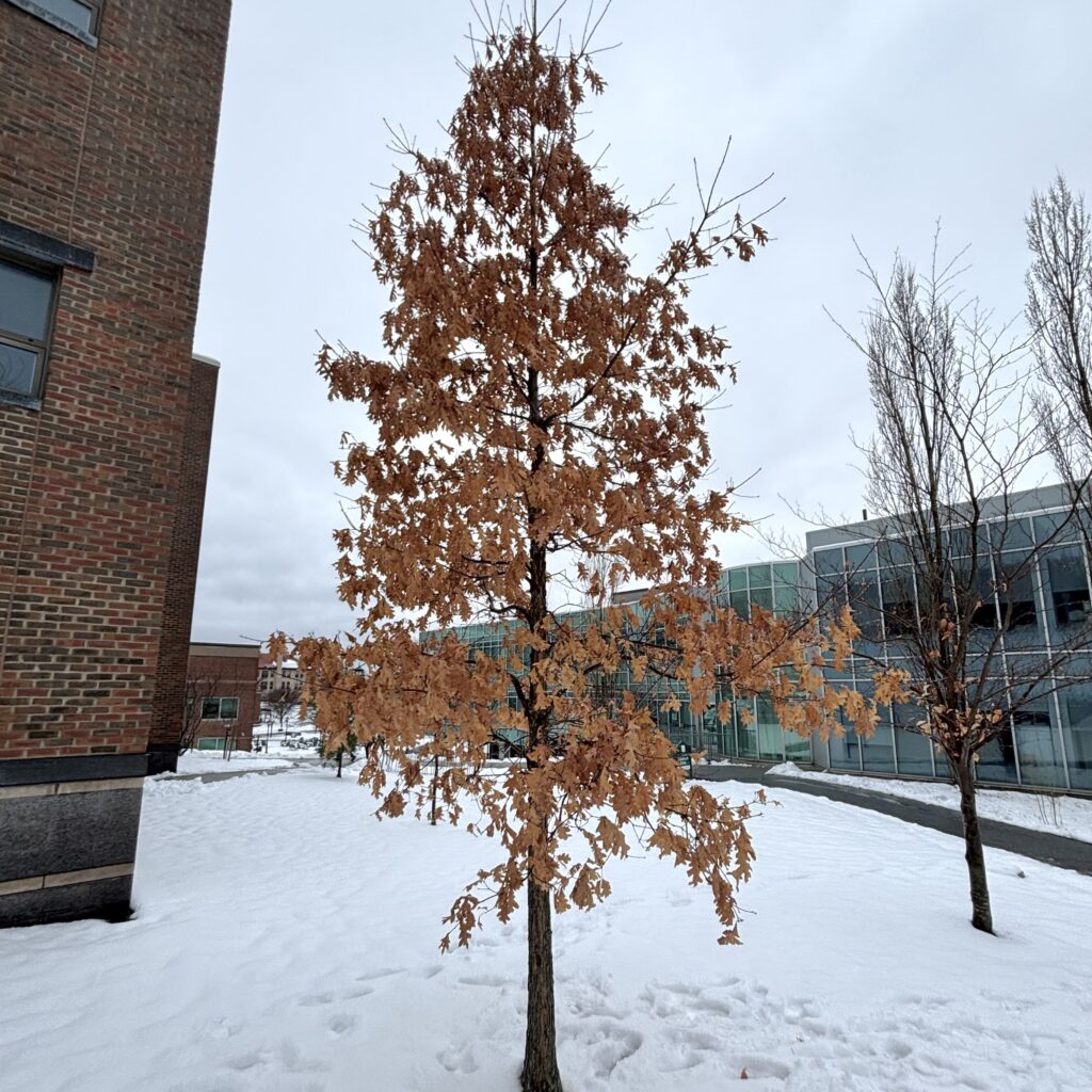 Just last week, most of the snow around campus had melted, and it felt like spring was just around the corner. However, with the weekend came more snow, and winter has returned. This early in the year, I did not expect to find many signs of life amongst deciduous trees, and I was correct in that assumption. I observed five different tree species around campus: red oak, sugar maple, white oak, red maple, and Norway maple. When I arrived at each tree, I observed 11 phenophases for each individual. All the phenophases were answerable by a yes or no, and are as follows: breaking leaf buds, leaves, increasing leaf size, colored leaves, falling leaves, flowers or flower buds, open flowers, pollen release, fruits, ripe fruits, and recent fruit or seed drop.