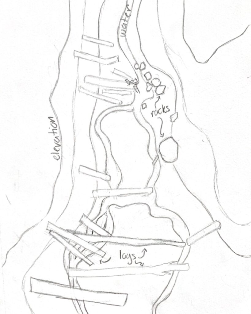 Before leaving, I get out my sketch book to draft a map of the area. Walking from one end to the other, I note the route the water takes as it flows through my site. I draw the major fallen trees in the area, as well as the rocks that influence the flow of the stream. I add some rough topo lines in an effort to show the way the hills slope up on either side of the stream. Then, with cold fingers and an approximate sketch of the area I decide it’s time to head home. Upon my return to my room, I draw out a more detailed and exact map on my tablet. I have included both the original, and the refined sketch below.