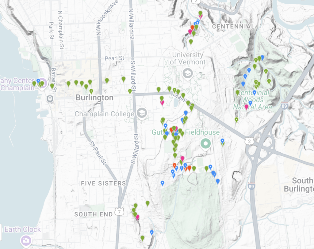 While I had originally envisioned a site along the Winooski River, after walking the River Walk to Salmon Hole trail I decided that the choices there would not suit my needs very well. On my way back from the river, I took a shortcut back to campus via Hildred Drive, and discovered the small patch of woods that would become my phenology site. This location is secluded enough that I can observe phenological patterns free from human disturbance, yet easy to access and close to campus. It offers both forest and stream bed communities, allowing for a variety of habitat and species to observe.