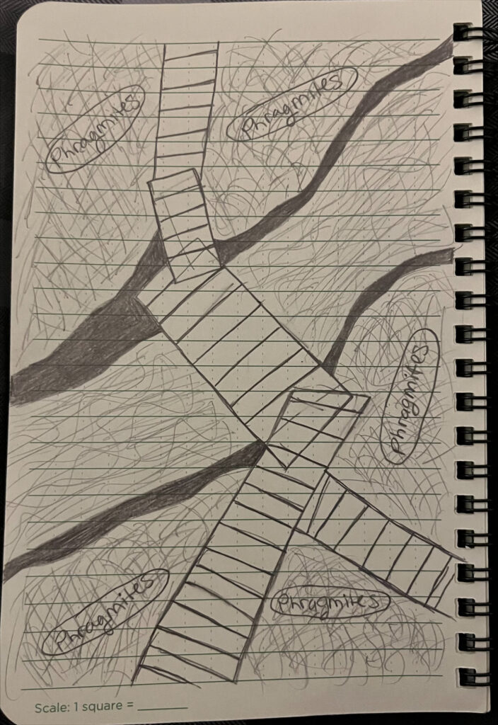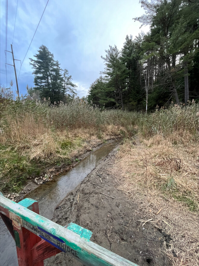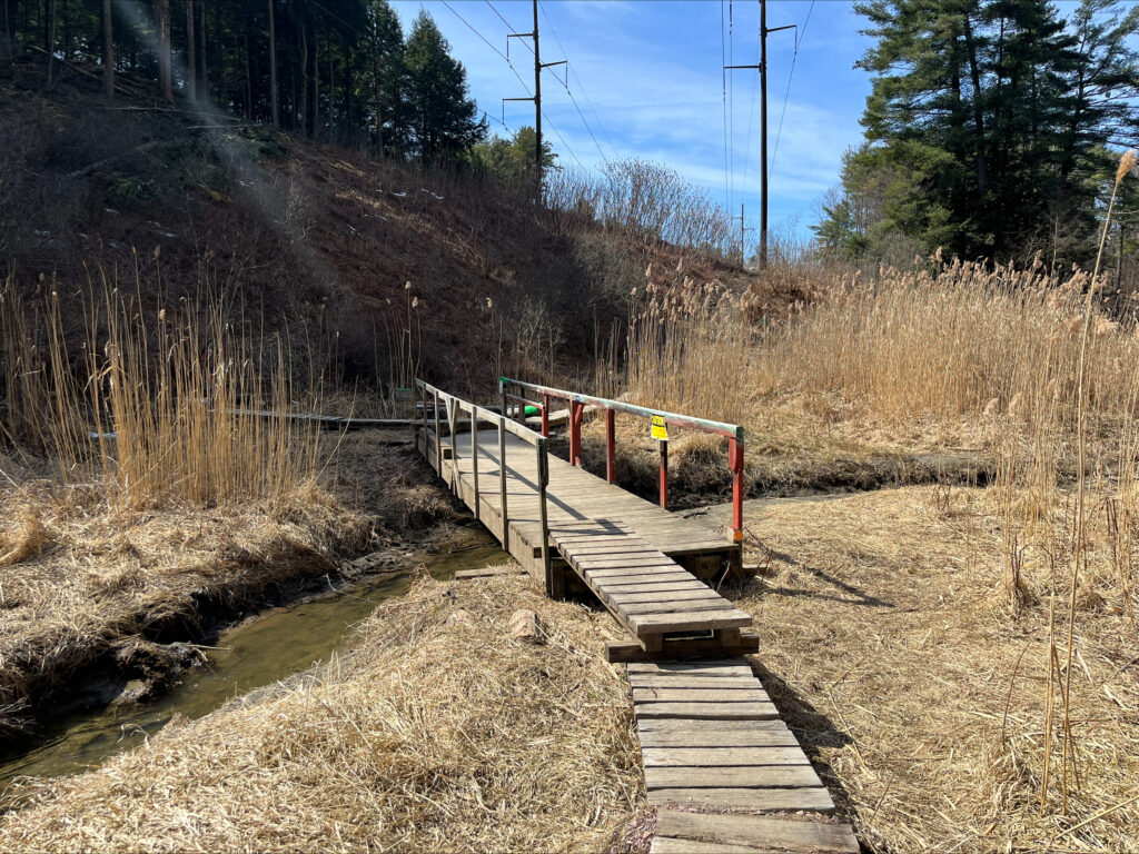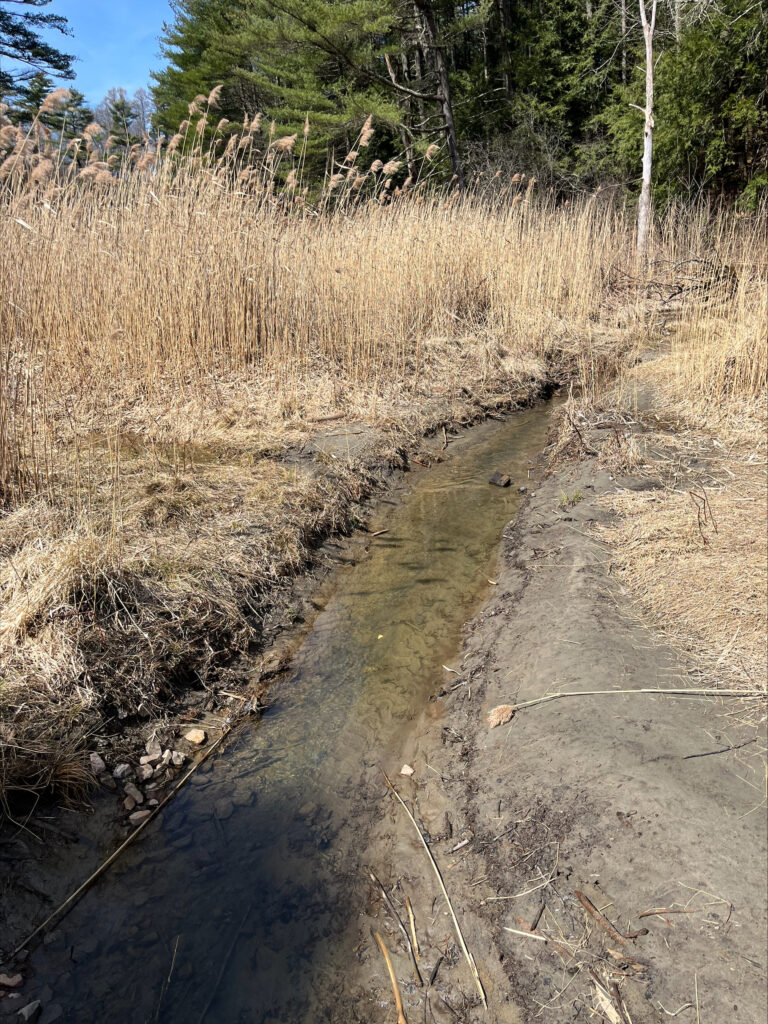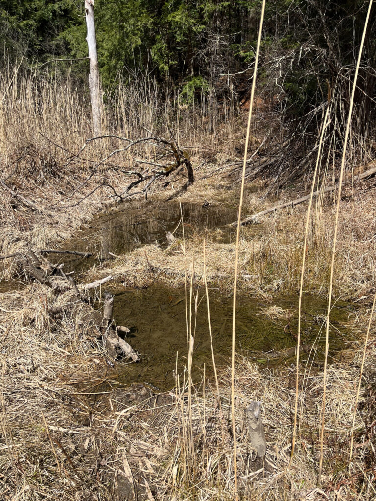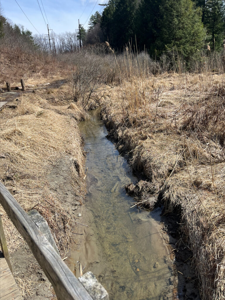 The most prominent landmarks at my phenology spot are definitely the wooden bridge/pathways and the stream running through the site. The stream has been the most important landmark to me, as this is what had drawn me to pick this site in the first place. The common reeds surrounding my spot have also been a prominent landmark, but they more so serve as a reminder of the prominent ecological instability present in Centennial Woods. Since my last visit, the little pool upstream from my spot has become a landmark, as this is where I found wood frogs.