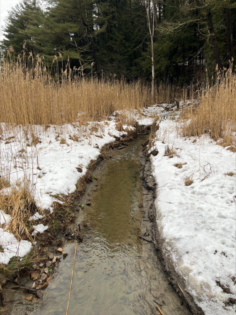 The most prominent vegetation changes don’t lie directly in my phenology spot; they are most noticeable in the surrounding area, especially the trees in the distance. In pictures taken during my first visit on 10/25/2023, the trees in the distance visibly had yellow leaves which had not yet fallen. Upon returning to the spot, many of the leaves on these trees had fallen, and the leaves that were still present were orange rather than yellow. Overall, the vegetation in the direct area was less green and less abundant. Sensorially, the most prominent sounds at the phenology spot are the reeds blowing in the wind. On occasion, a miscellaneous noise may be heard from the reeds- possibly a mouse scurrying through. Bird calls can be heard throughout the area, most identifiably crows, along with the faint chirping of various insects. The running stream is incredibly peaceful, however, the dominant presence of invasive species such as Phragmites troubles one’s mind while sitting at this spot.