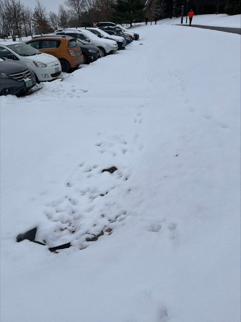 For the “Wildlife in Burlington” phenology blog post, I decided to mostly stay on campus and do some mammal tracking. The main area which I explored was the open area with some trees by the Davis Center Tunnel exit. I figured this area would have at least some activity, due to the presence of scattered trees and the lack of man-made pathways. First, I’ll start with the tracks that were relatively easy to identify, and some of the straightforward mammal sightings: