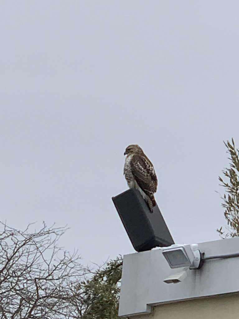 Here is a hawk I saw on my walk searching for vermin. In winter time, predatory birds are much more conspicuous, and with less daylight hours, can hunt more actively. While spring does approach, observations like this still suggest that winter clings on!