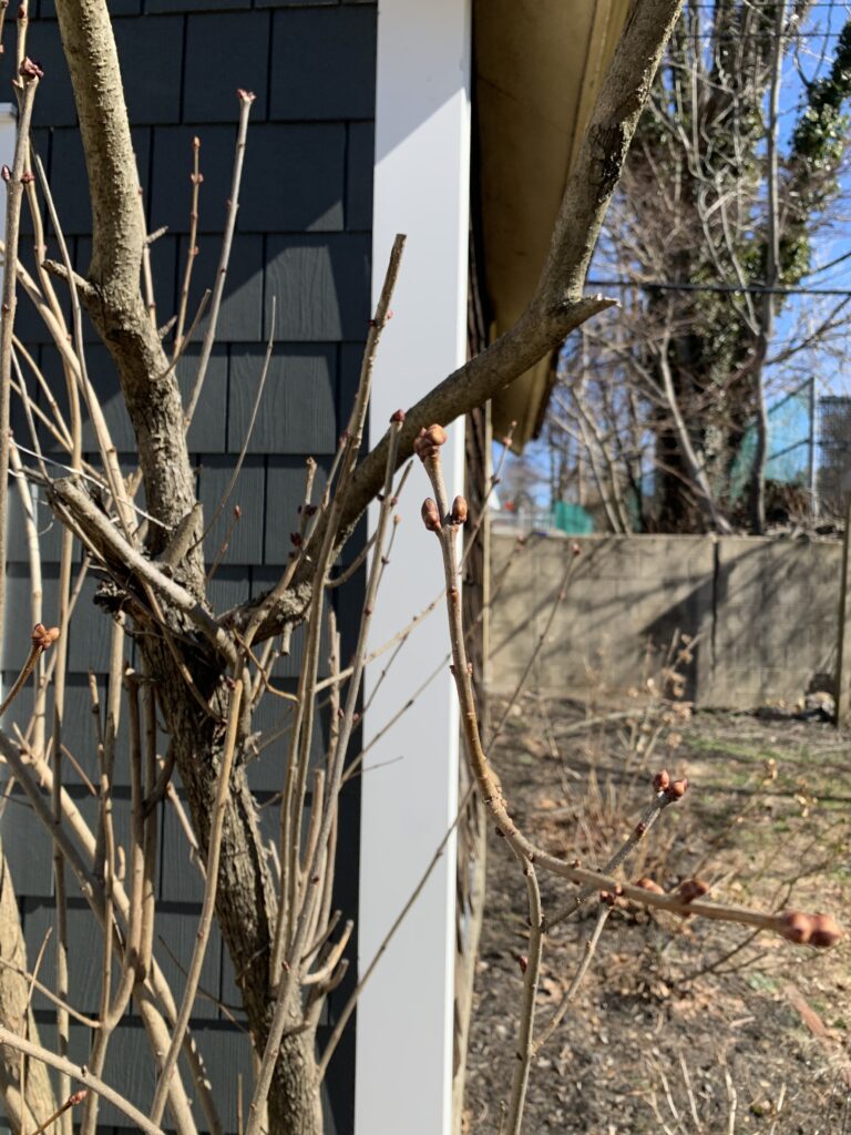 Buds on not so much a tree but more a hardy shrub, Lilac (Syringa vulgaris)! Lilac is an early bloomer who in the next month will be displaying its beautiful purples and great scent.