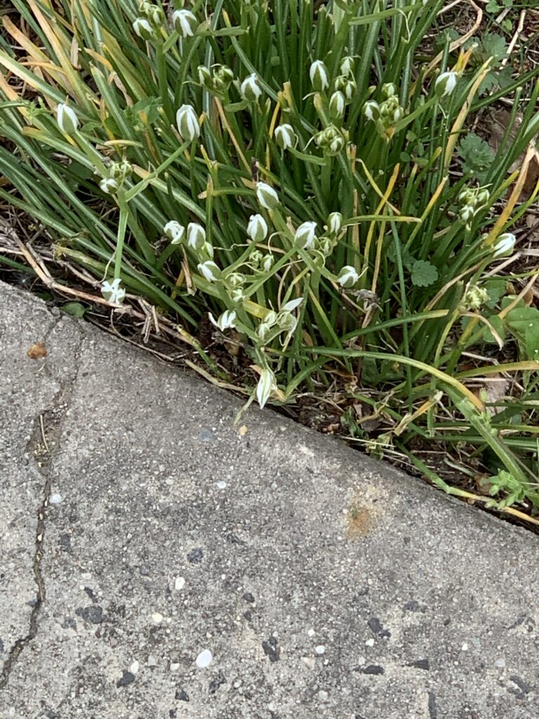 Along my suburban sidewalks I find a lot of common planta growing through the cracks. This is Star-Of-Bethlehem, which I don’t see too often! They look like white shining stars when they bloom.