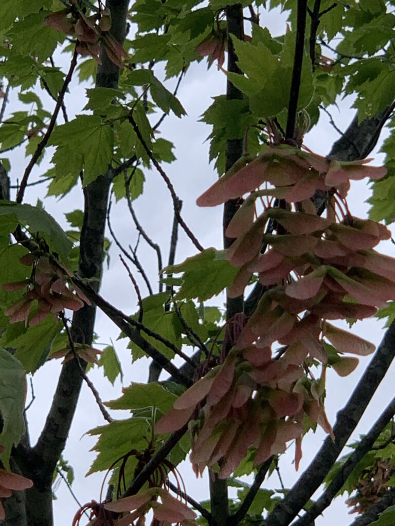 Here is a (not so) Red Maple. It has a ton of samaras on it. Red maple samaras are red, in contrast to those of sugar maple, which are green in spring. These samaras disperse in spring before the leaves are fully developed