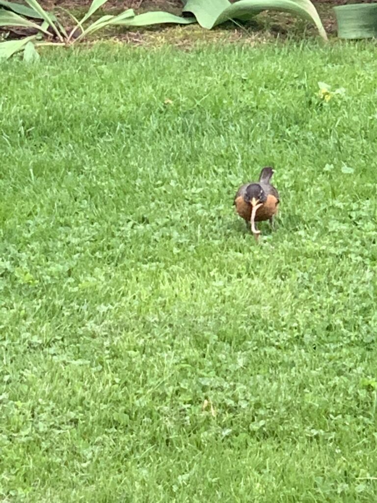 I watched this American Robin pull this worm right out of the ground! I wish I took a video of it, but I could only snap this photo before the worm was devoured. Robins, sparrows, and morning doves are the most common birds that I spot around me.