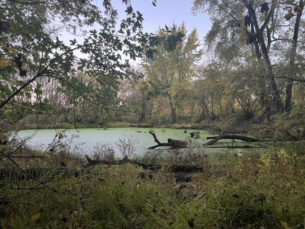 The vegetation in this area is mostly short, herbaceous plants that are starting to turn brown and die from the coming cold. I observed Riverbank Grape wrapped around trees on the edge of the pond, False Nettle, Tall Blue Lettuce, and Wild Raspberry in the surrounding woods and Jewelweed growing right on the banks of the pond. The most common woody plants are enormous, old Eastern Cottonwood trees that create the canopy and tower over everything else. There are also many Green Ash trees and several Boxelders.