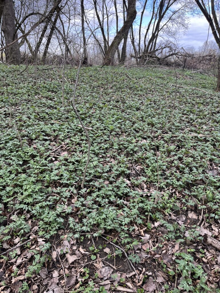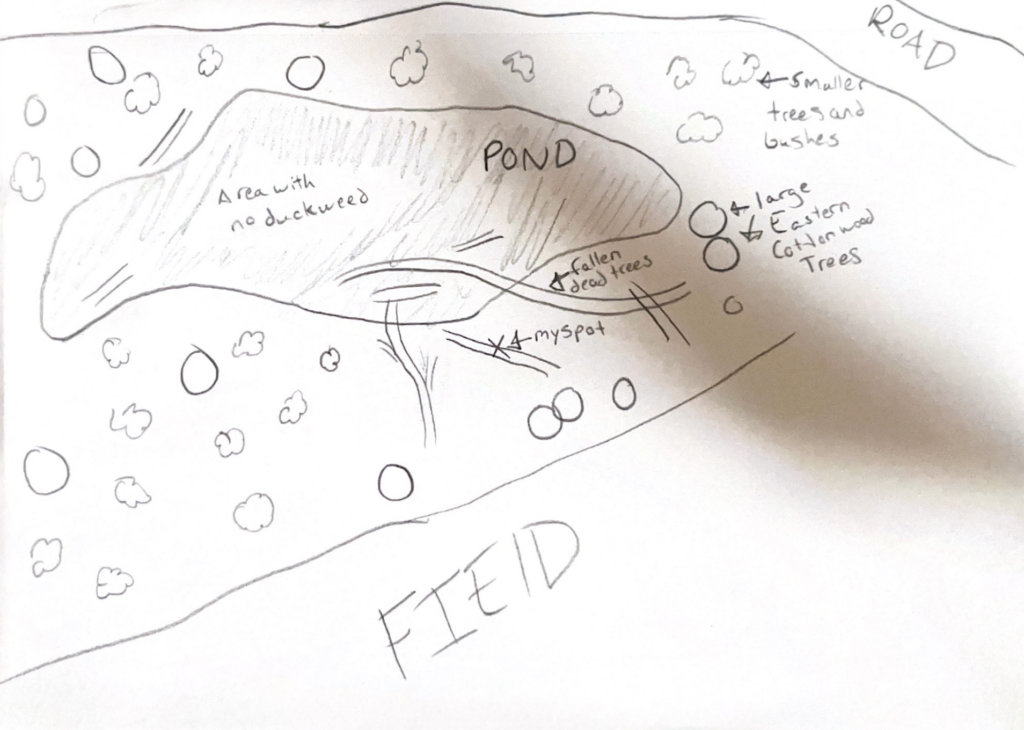 My phenology site has changed dramatically from over the winter. There is now no snow, the duckweed that was on the pond has grown back, turning the surface of the water green, and there are still no leaves on trees, although many buds are starting to open. There is a carpet of small green plants on the forest floor, mainly composed of garlic mustard, an invasive species. There are no new fallen trees and no major human or storm-caused changes. Some of the landmarks I’ve become familiar with are the fallen boxelder tree in front of the pond, the large eastern cottonwood trees still standing tall, and the shape of the pond, which hasn’t grown or shrunk noticeably over the winter.