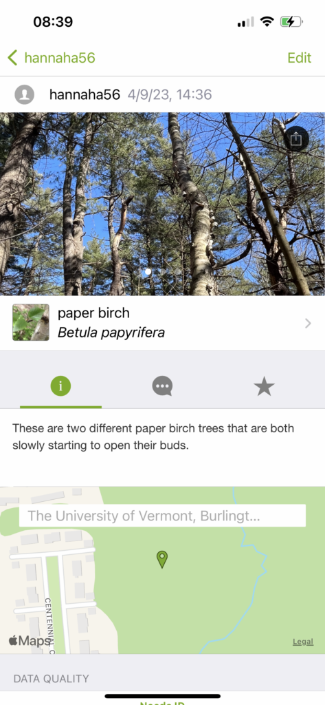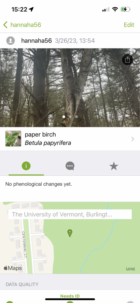 For the Burlington BioBlitz, I went into Centennial Woods, as well as spotting several species around campus. My experience using iNaturalist was good, I found it easy to use and helpful in identifying plants I didn’t know. I tried to document a variety of species – I submitted observations of a tree that I didn’t recognize, lichen, moss, two bird species (a Black-Capped Chickadee and a House Finch), and a Gray Squirrel taking some seeds from the bird feeders at the trail crossing in Centennial.