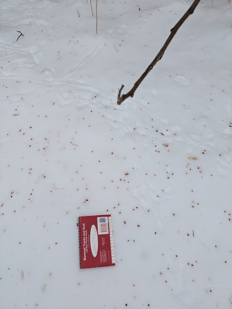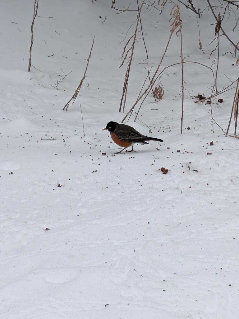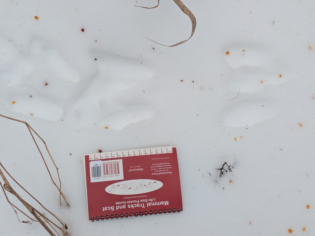 For this month’s phenology assignment, I decided to head over to Rock Point. On the walk there, through the bike path, I found a few sets of tracks and spotted many birds. Specifically, the first tracks I saw were a jumbled mess of prints left by a bird. They circled around some seeds dropped by a nearby shrub. Identifying these prints as American Robin required no guesswork since I spotted at least five of them feeding on the seeds shortly before I arrived.