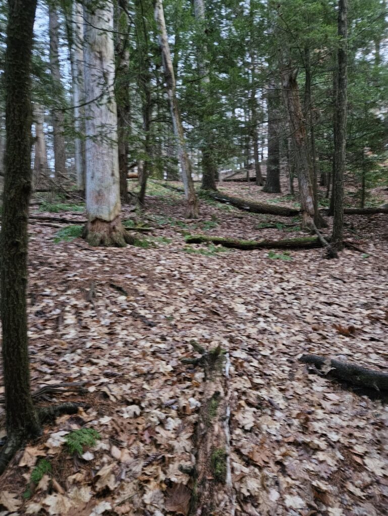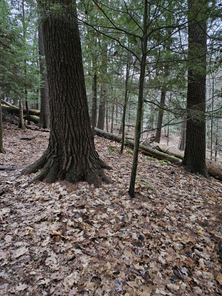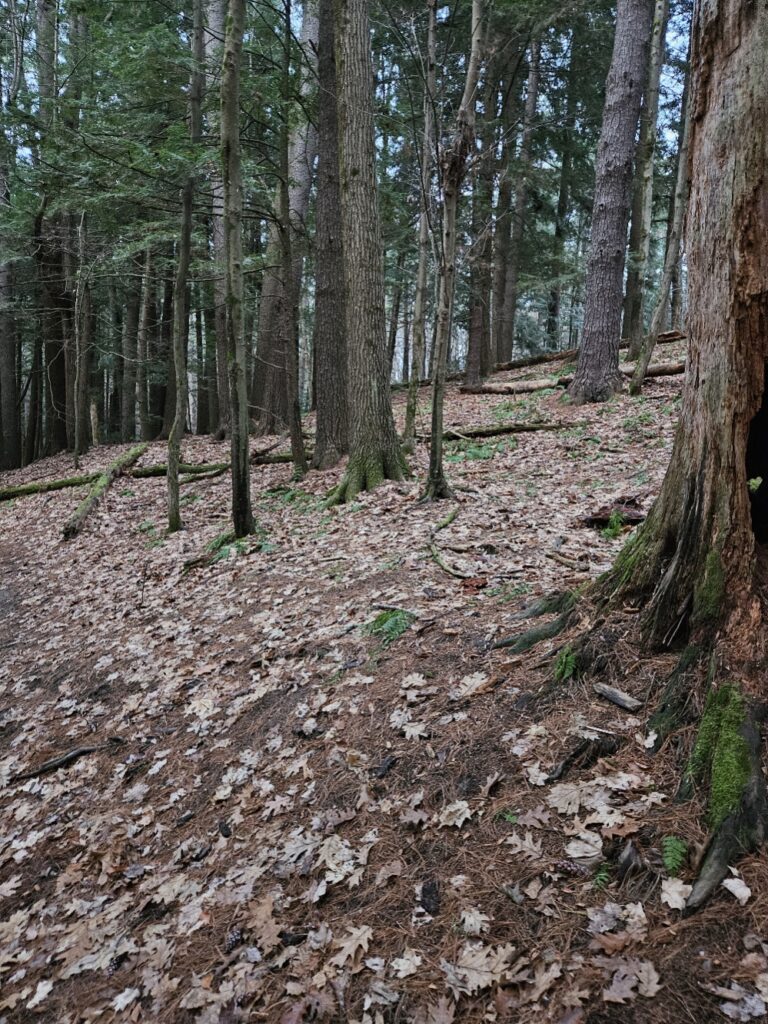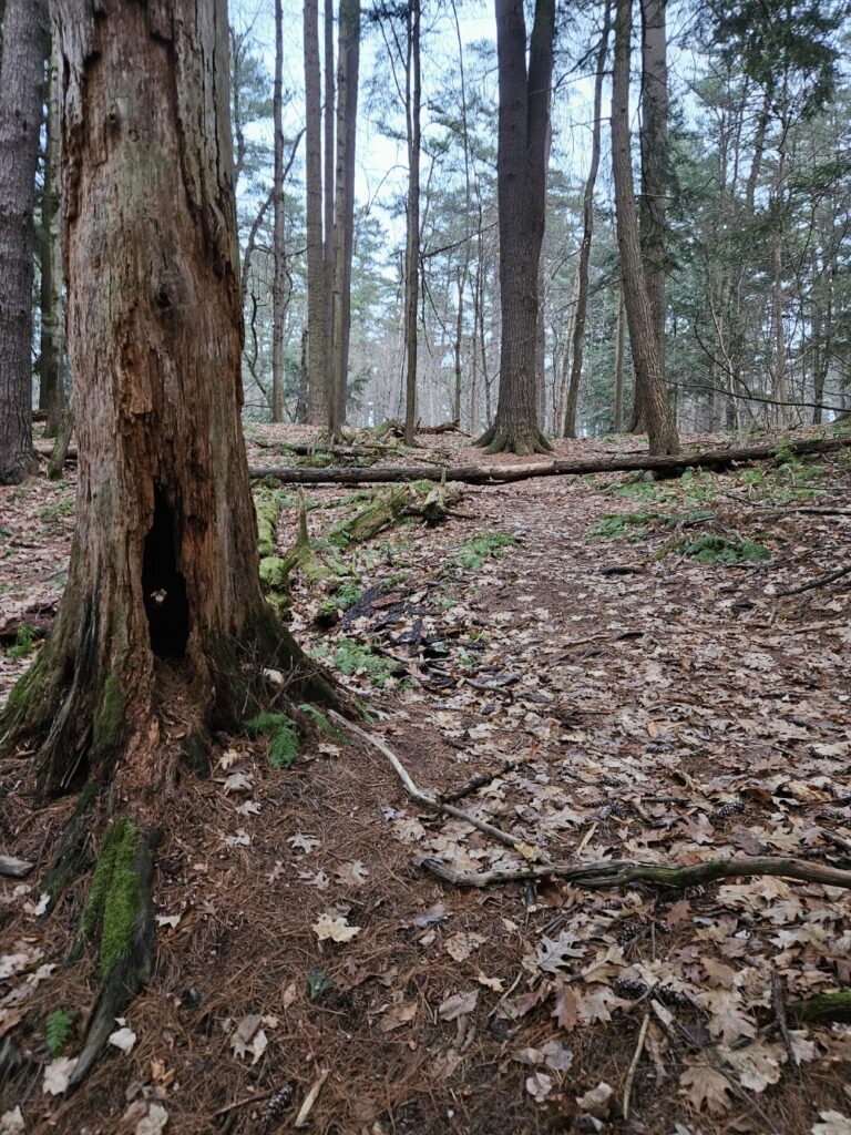 Decomposition seems to be the lay of the land right now, the dead trees are damp with moisture and mold while the leaf litter is slowly turning to a dirt color. The world is quiet without any animals being obvious. No nesting, no bird calls. There is a hole in an Eastern White Pine that may be used as a shelter by some animals, but as of right now, there is nothing nesting there. Animal activity has never been obvious in this area, a well-trodden path makes it difficult for animals to make a home nearby, however, there are no more bird calls, there is instead just the silence of the wind.
