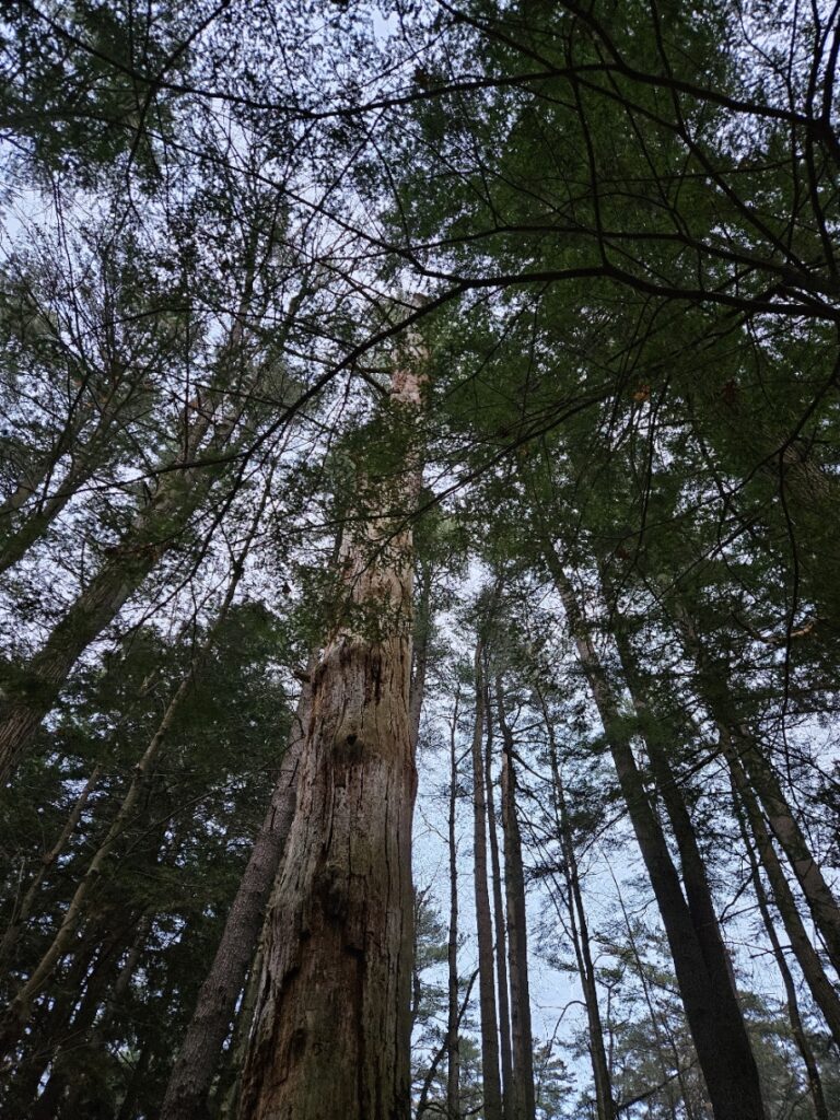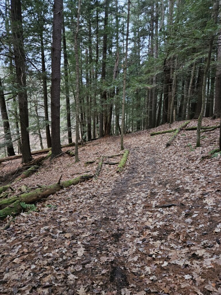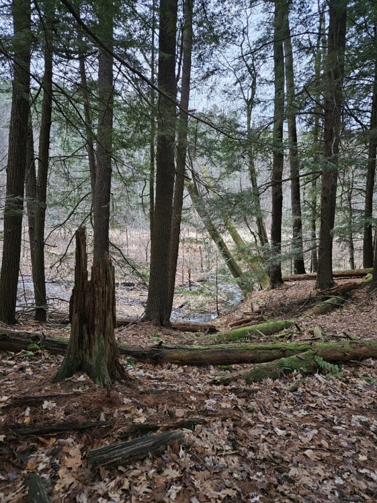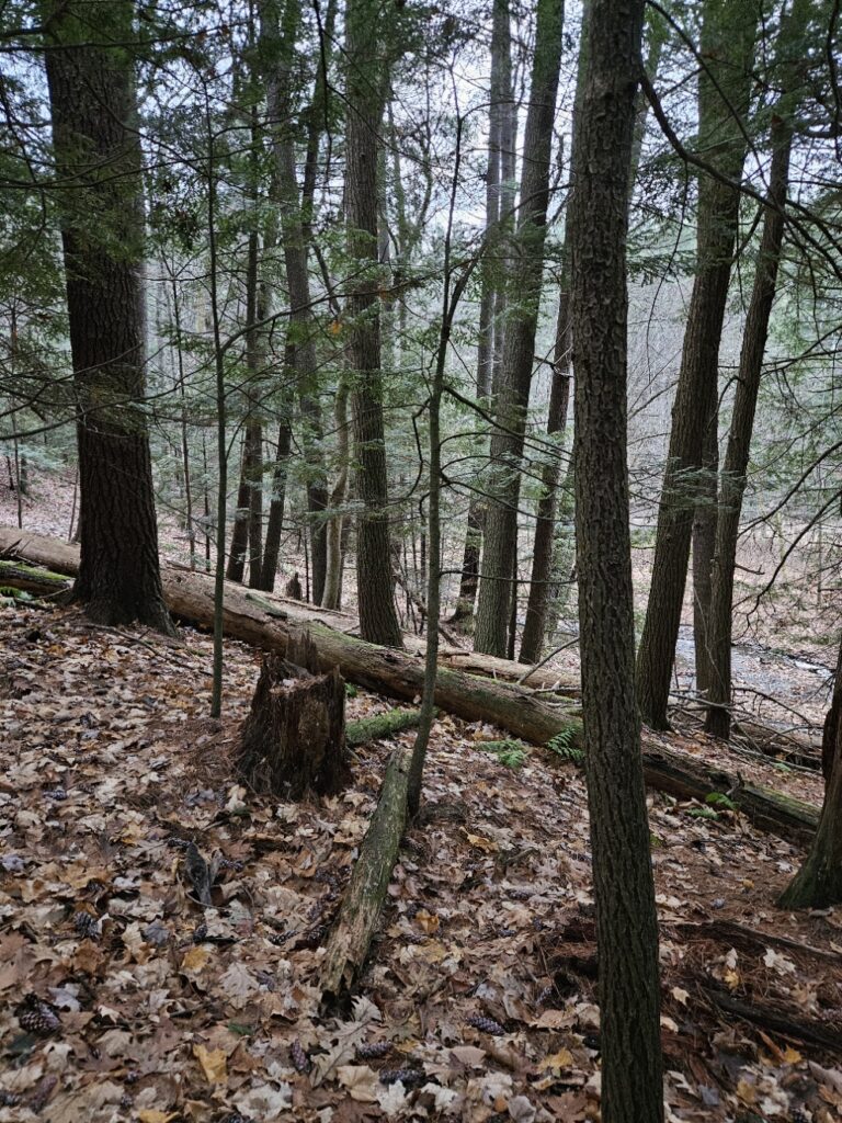 Decomposition seems to be the lay of the land right now, the dead trees are damp with moisture and mold while the leaf litter is slowly turning to a dirt color. The world is quiet without any animals being obvious. No nesting, no bird calls. There is a hole in an Eastern White Pine that may be used as a shelter by some animals, but as of right now, there is nothing nesting there. Animal activity has never been obvious in this area, a well-trodden path makes it difficult for animals to make a home nearby, however, there are no more bird calls, there is instead just the silence of the wind.