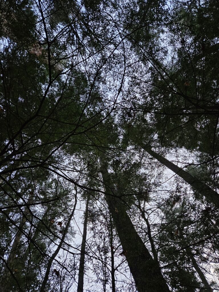 When I finally get to my spot, its changed. The deciduous trees, most notably the Sugar Maple that stands next to me and the large American Beech in the center of my site are barren, even their last stubborn leaves have fallen to the ground, leaving dark twigs reaching into the air. The Eastern White Pines and Eastern Hemlocks are the same as ever though– just the carpet of pine needles below them have turned brown rather than orange. The ferns are also the same, still green after frost and snow.