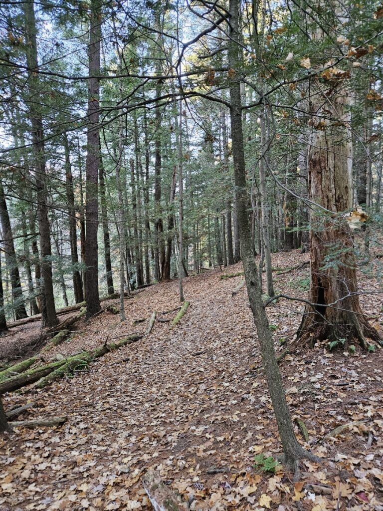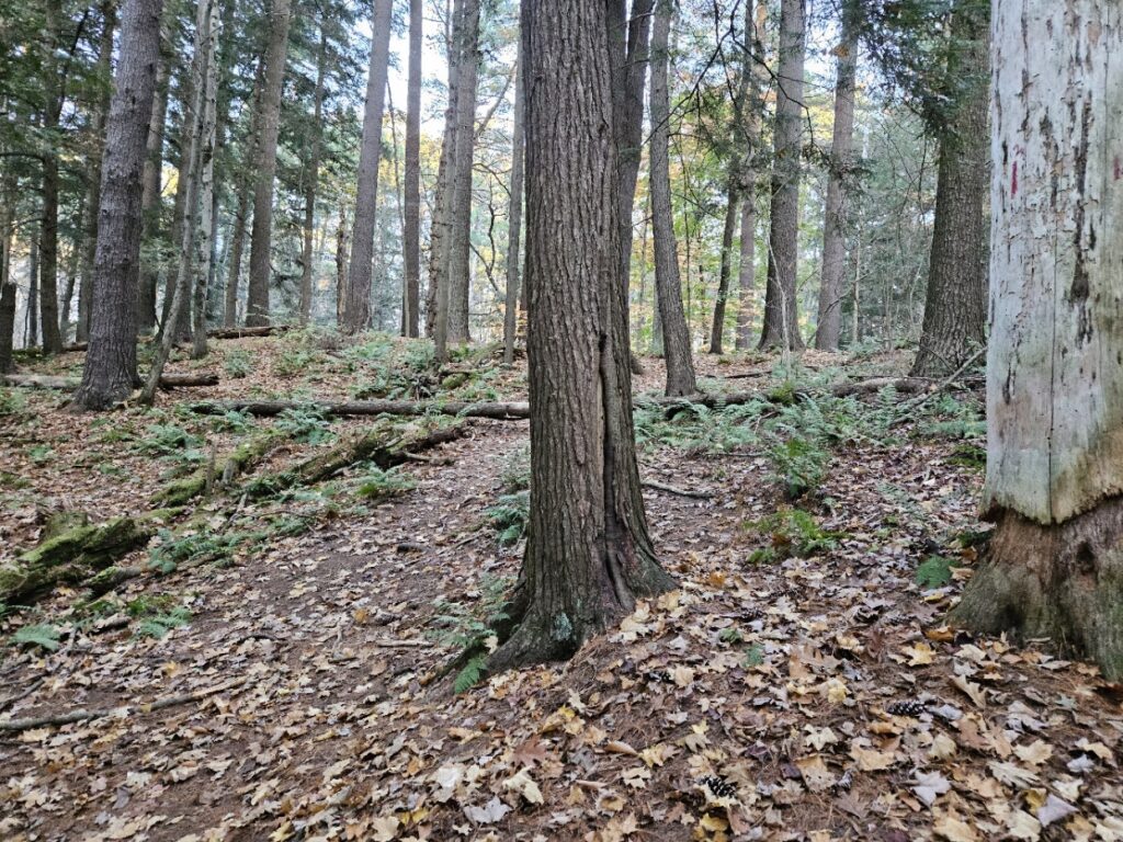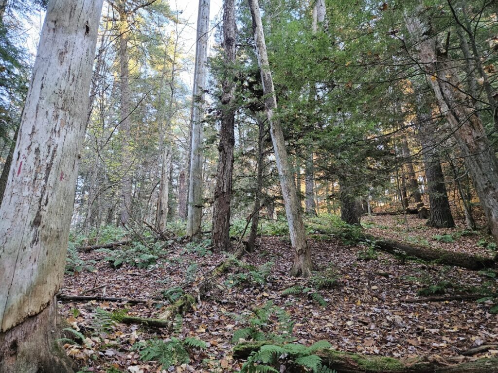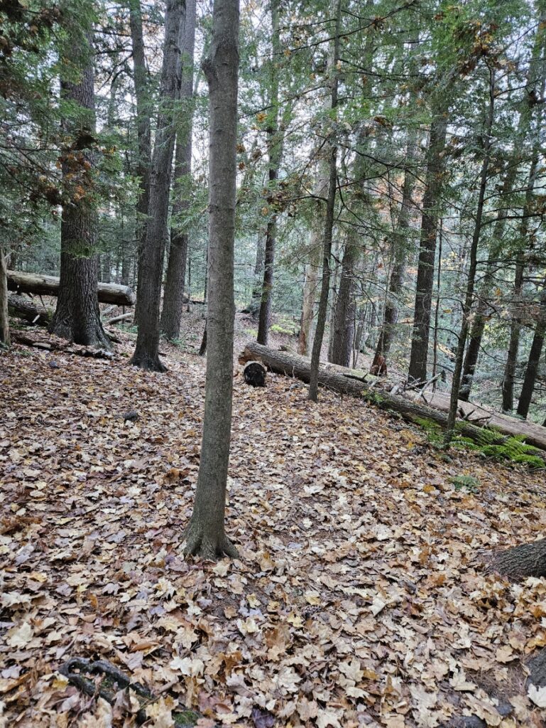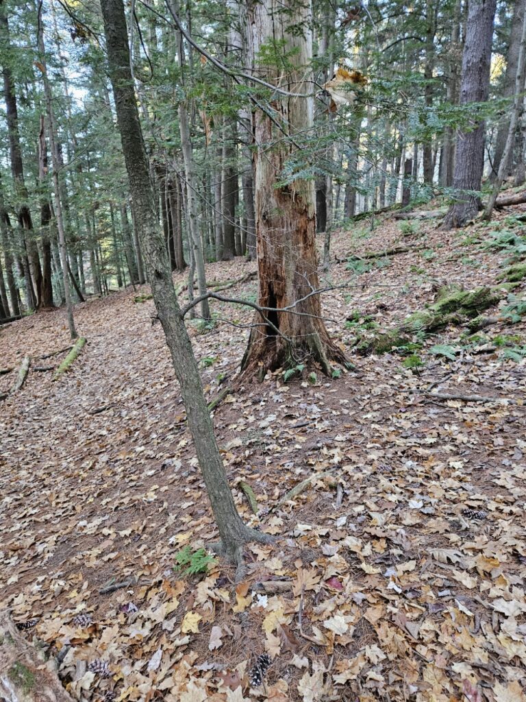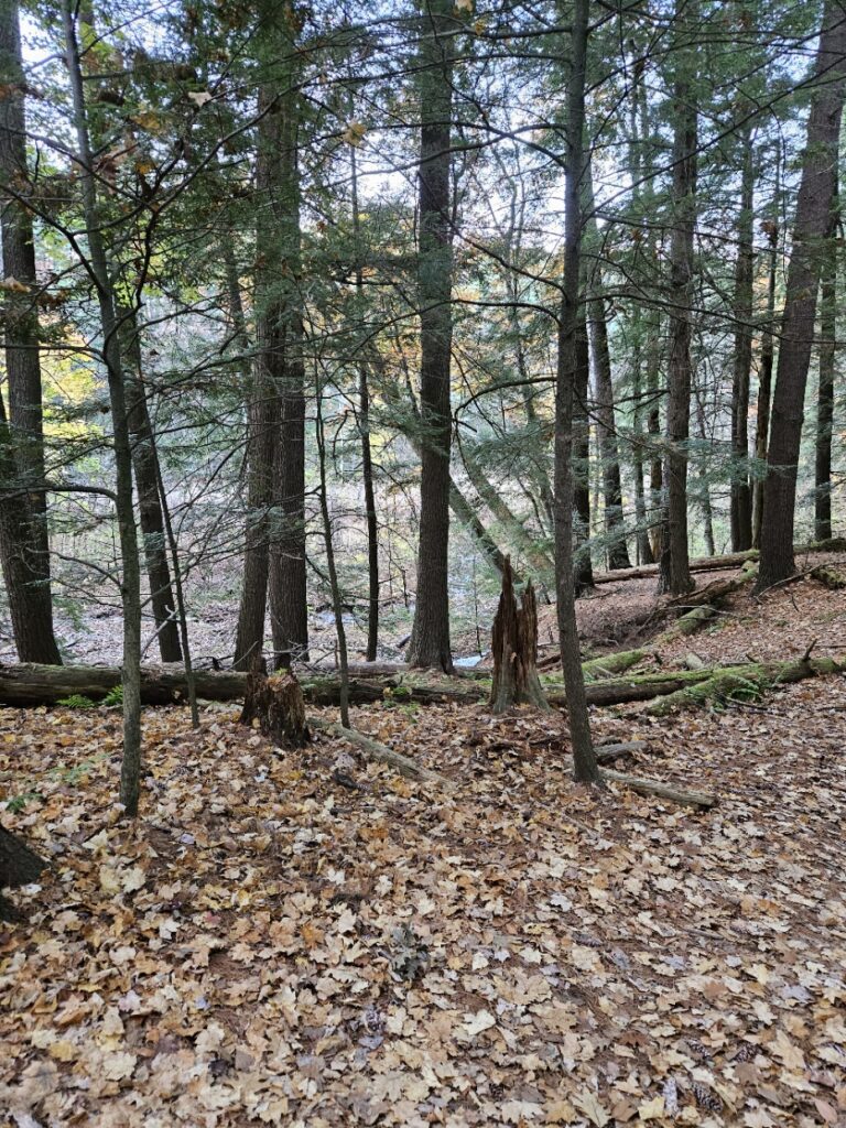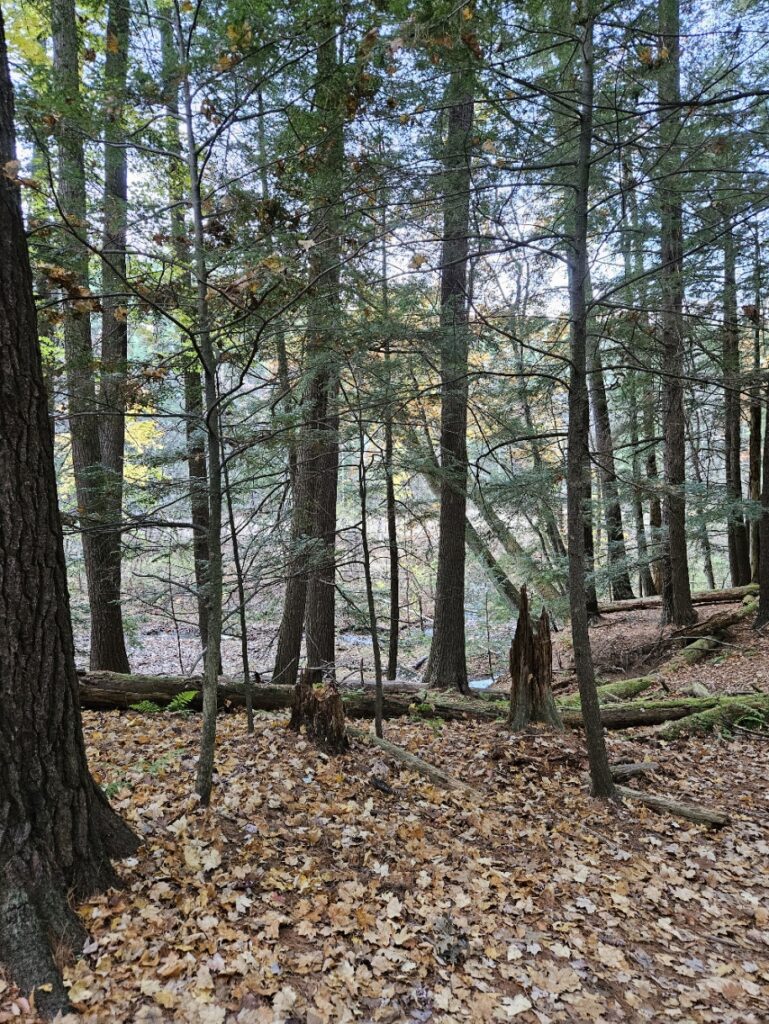 The Ferns have mostly died off at this point; only a few remain green and visible to my eye. They shelter next to downed trees, as if they were a child begging to be let into a locked house. Above them, unchanging, are the guardians of the forest– Eastern White Pines. They cling to their dagger-like needles, refusing to budge despite the frost. They remain green in a dormant landscape. Contrast to the bare limbs of our hardwoods, the Eastern White PInes stand in opposition to heavens, almost as if saying that not even the gods can change them. Eastern Hemlocks below their big brothers in the evergreen world follow suit, clinging to their tiny green needles as well. These two trees refuse to be influenced by the cold or wind to drop their leaves. Further next to them stand a few solitary snags– dead trees that are still upright. Though they no longer live, they provide habitat and shelter for the creatures of the forest– making them a comforting presence. Their dead, decaying limbs also stand up to the sky, although much weaker than their living counterparts. They are fading embers that look to the sky for their future.