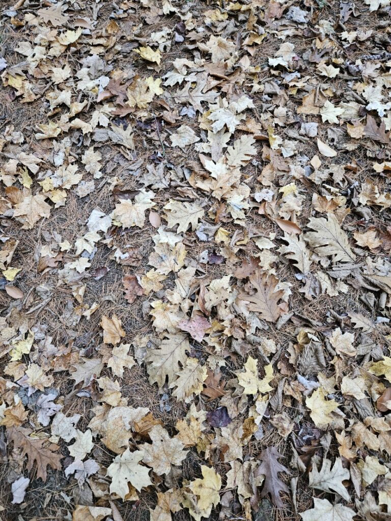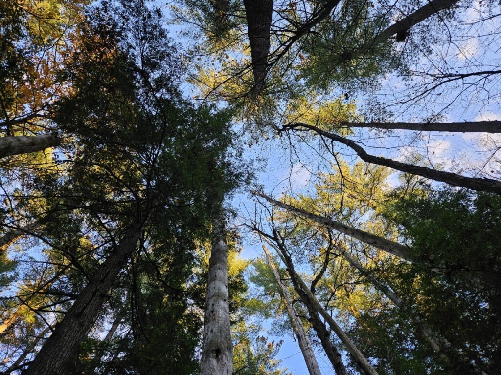 I look up– the yellowing leaves, green needles, and bare limbs all make for a striking canopy. A true memento of what time is doing– symbols of past, present, and future for the forest.