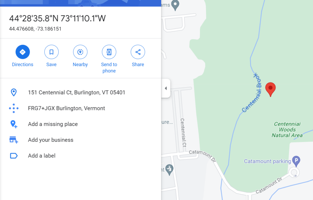 But how does one get to this spot? The answer comes in two parts, depending on how you like your directions. The simple way would be to drop a link which uses google maps to bring you there. But other directions to get there include walking down from the centennials woods trailhead until you cross over three bridges/wooden footpaths and come to a slightly more open clearing.