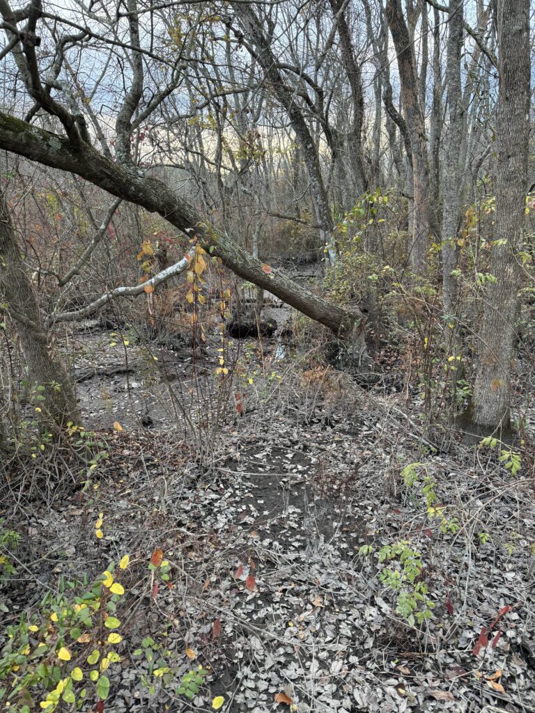 Entering the forest, I noticed it was more still than in past visits. Within the trees, there was shelter from any wind. What had previously been an array of yellow, orange, and red leaves covering the ground was now a thin layer of brown leaves. The thin layer indicates that decomposers such as earth worms were out and working hard. The Norway Maples which had previously been the last to keep their leaves had scattered their leaves with the rest.