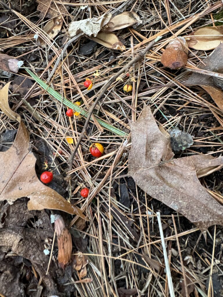 Although some bird nests could be seen in the nearby trees, birds themselves, could only be heard in the distance by listening very closely. It was a vast change to the chirping and rustling previously heard within the forest during past visits. No other animals were heard or seen, however, suspected homes in the holes of trees were identified. The only berries in sight were those picked from a tree or bush nearby and brought the base of a white pine tree nearby.