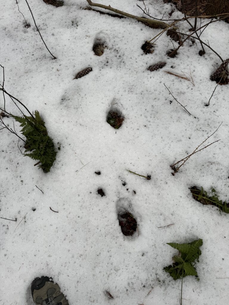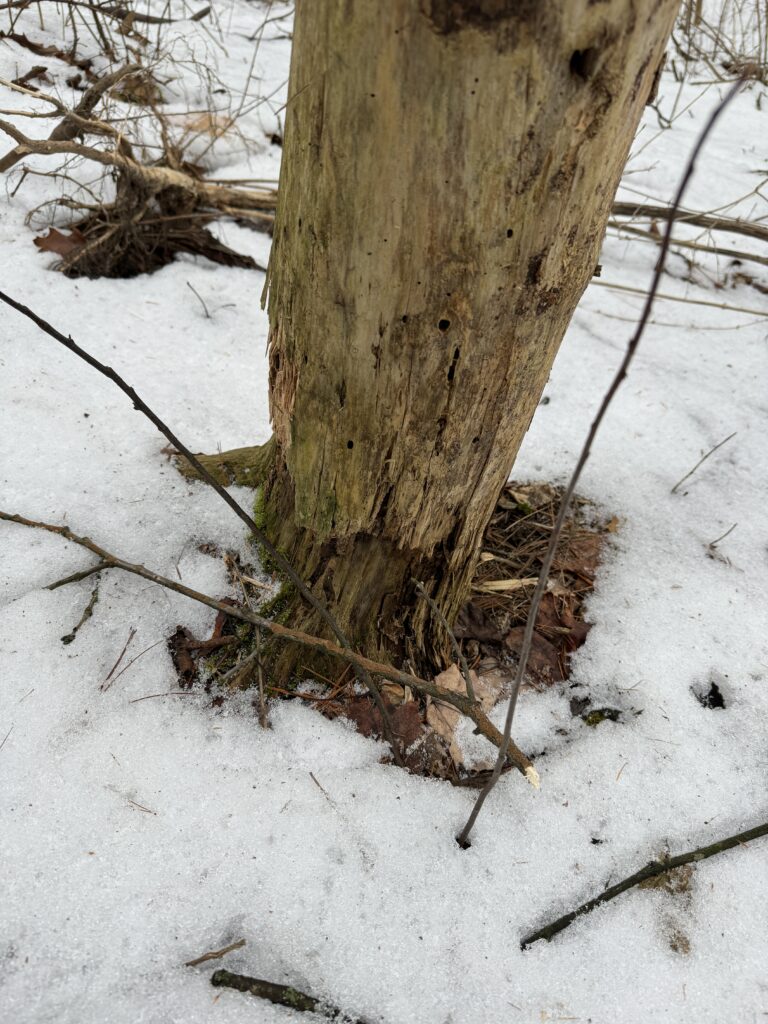 Despite the struggles between melted ice and snow, there were some potential deer tracks in sight. The melt of the snow made seeing the shape of the paw/hooves impossible. However, the spotted tracks seemed to be about a foot and a half apart and were mid-sized holes in the snow, marked by a walking and trotting pattern, in a roughly in a straight line. Despite the straddle of the tracks being quite small, the hooves/paw prints were quite wide, indicating that this likely was not a greatly small animal. The only other directs signs of animals came from the potentially chewed bark off the bottom of trees. This bark was likely consumed by creatures living in the subnivean zone when the snow was higher.